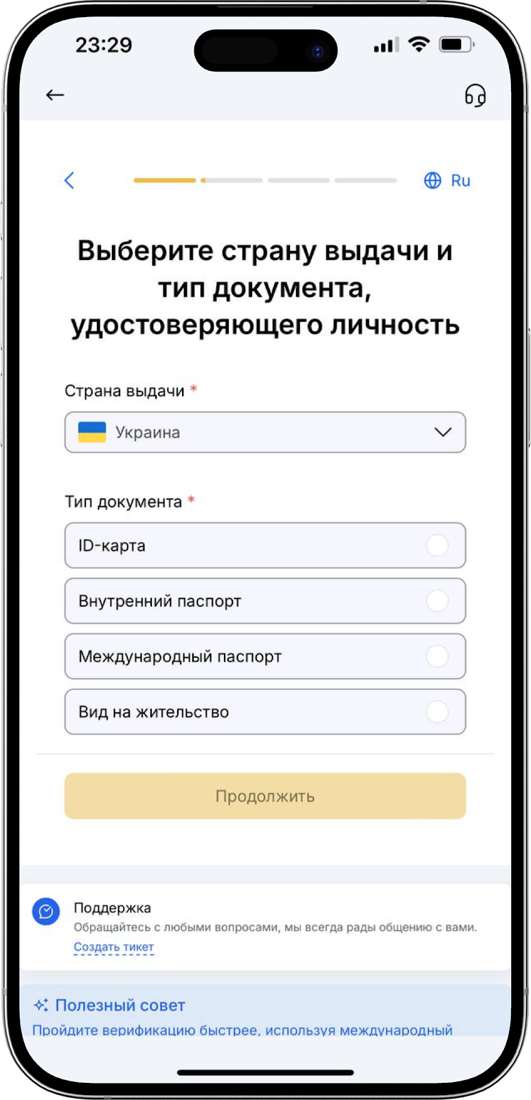 Обратите внимание: если вы не можете найти свою страну проживания в списке во время прохождения полной верификации, и эта страна не входит в список запрещённых на нашей бирже, пожалуйста, попробуйте пройти стандартную KYC-верификацию.