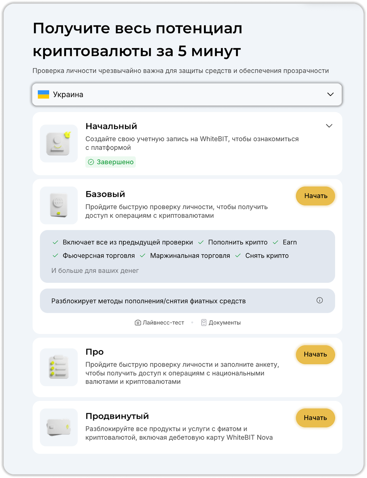 1. Выберите свою страну и нажмите “Начать” возле соответствующего уровня верификации.