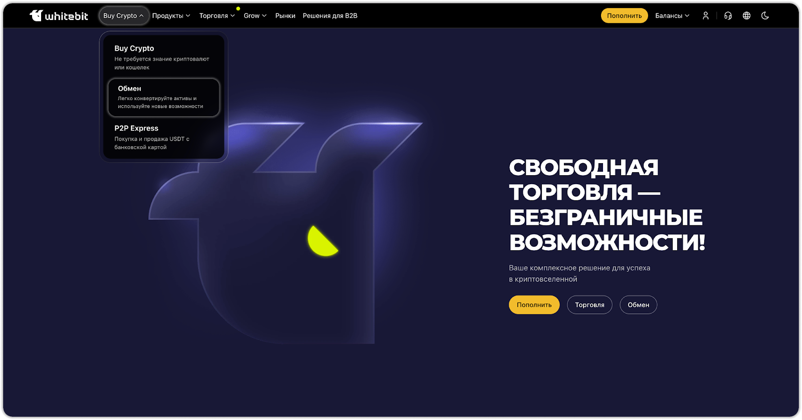 Вы можете найти страницу “Обмен” в разделе “Buy Crypto” в верхнем левом углу экрана, нажав на вкладку “Обмен”.