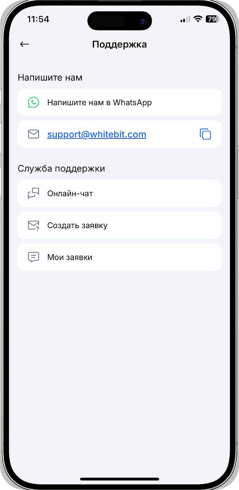 support@whitebit.com – для связи с технической поддержкой биржи.