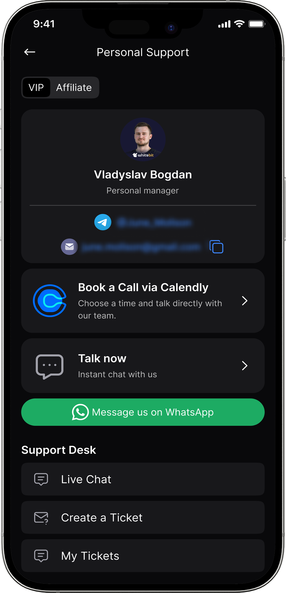 В рамках VIP-программы пользователям доступен виджет персональной поддержки, который обеспечивает связь с их персональным менеджером.