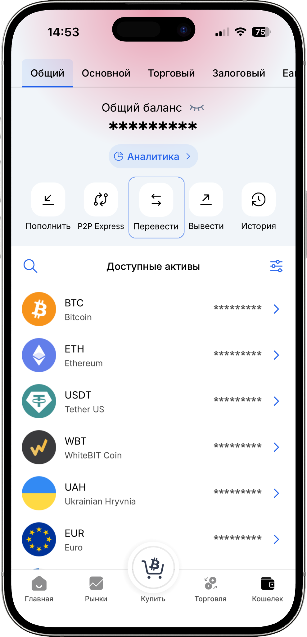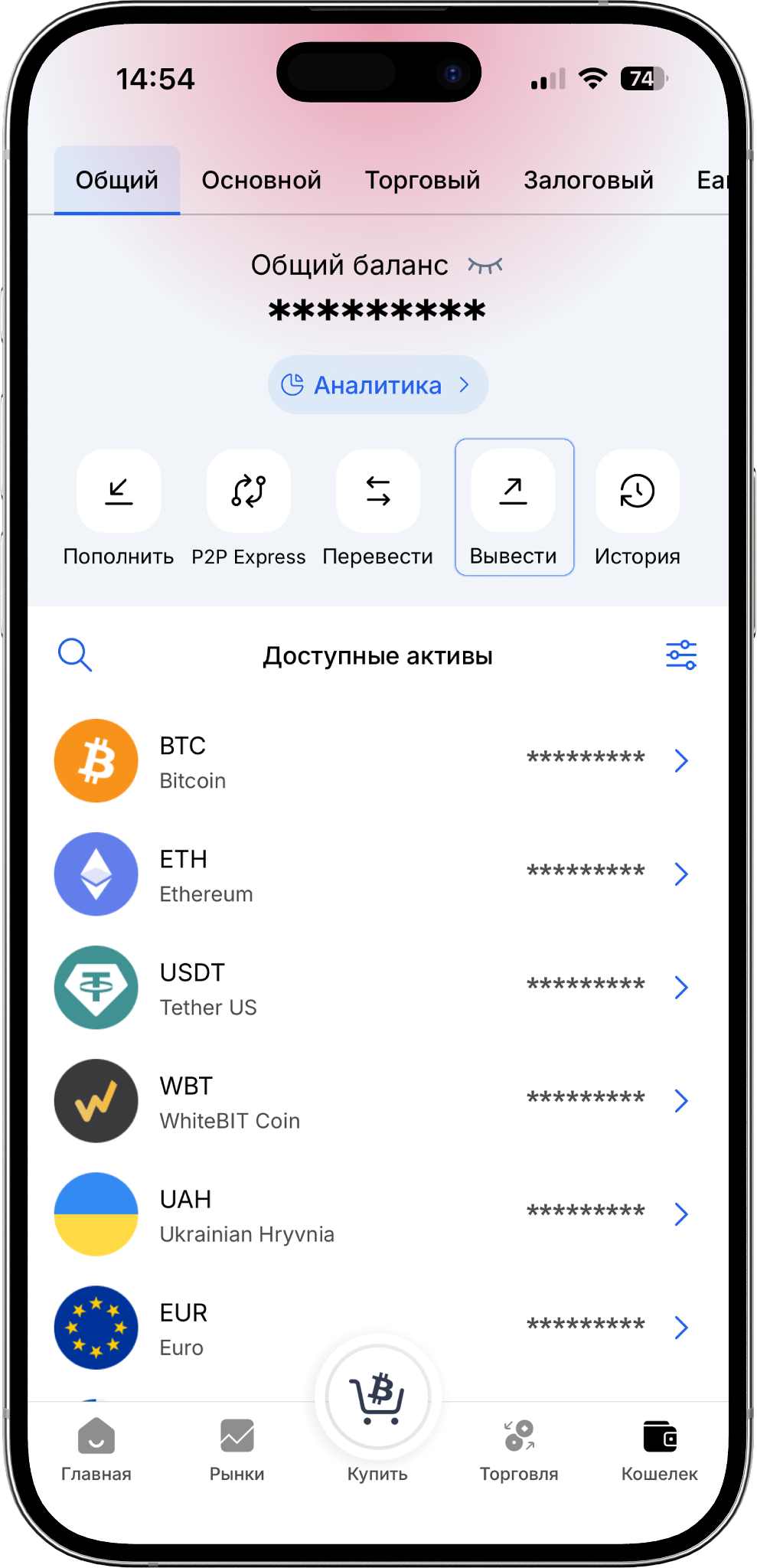 Как только средства поступят на "Основной" баланс, можно приступать к самому выводу. Давайте пошагово разберем, как вывести средства с WhiteBIT на другую платформу в приложении на примере монеты Tether (USDT).