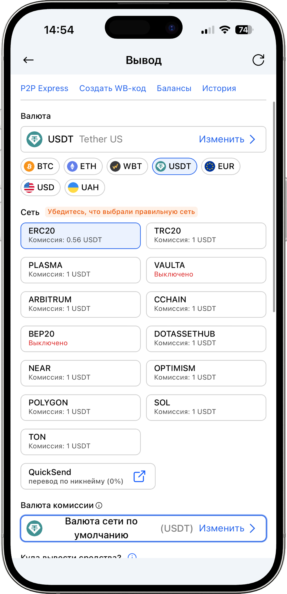 Нажмите кнопку "Вывод" во вкладке "Кошелек" и из списка доступных монет выберите USDT.