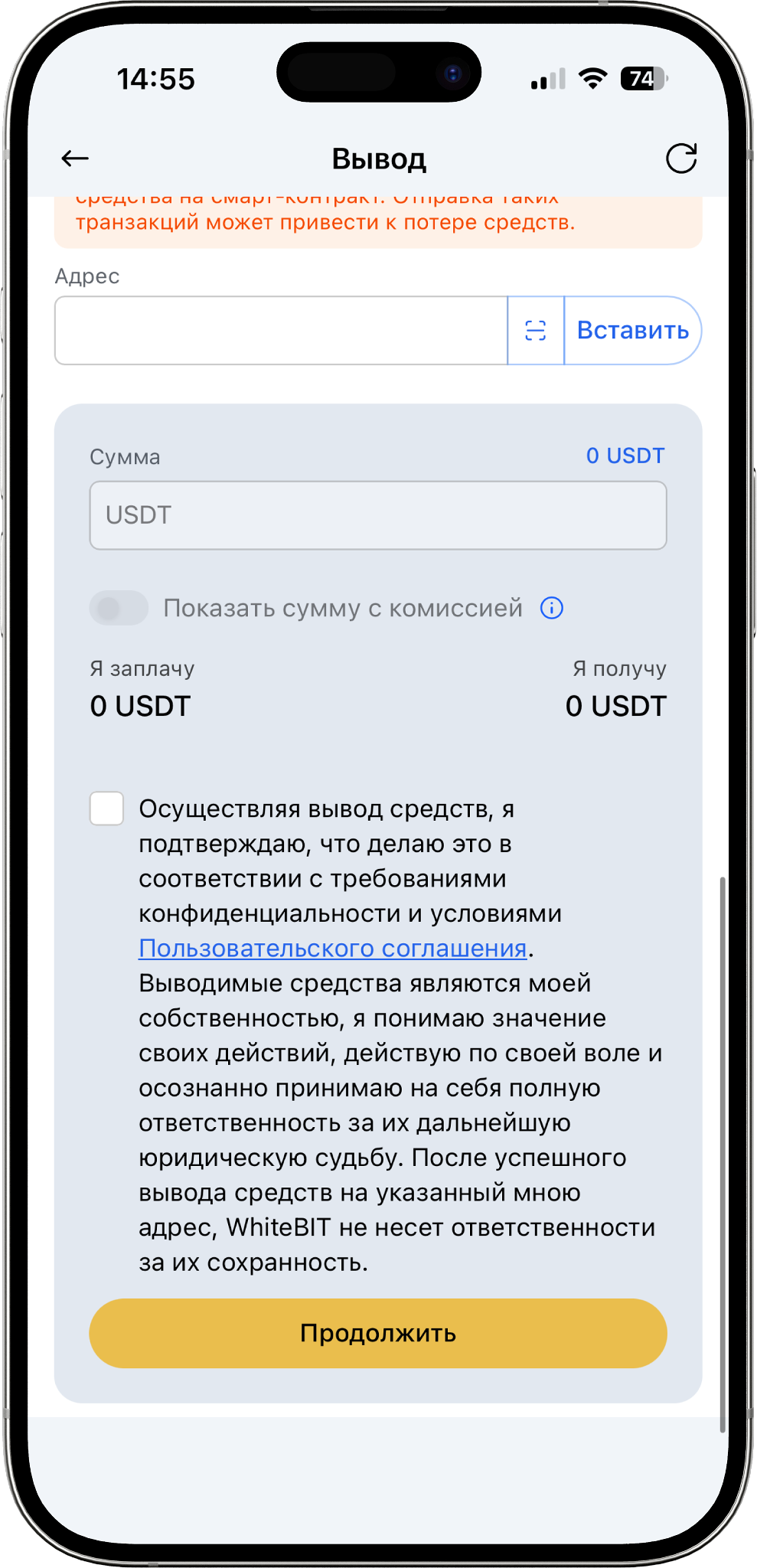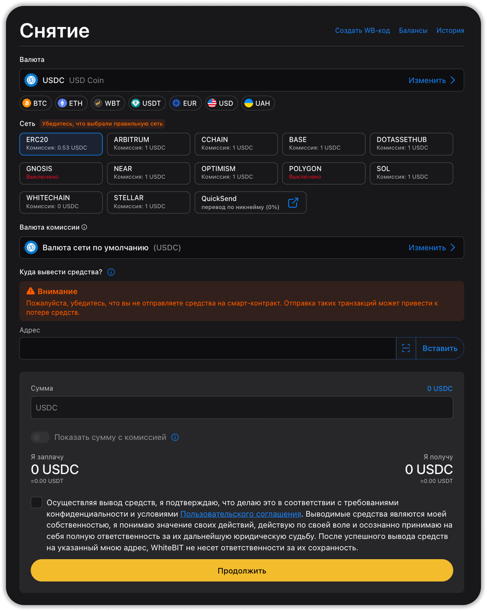 Ознакомьтесь с важной информацией вверху окна вывода. Выберите сеть (если это необходимо), выберите валюту, в которой будет списана комиссия за перевод средств, укажите адрес вывода или отсканируйте QR-код адреса на принимающей платформе, укажите сумму и нажмите кнопку "Продолжить".