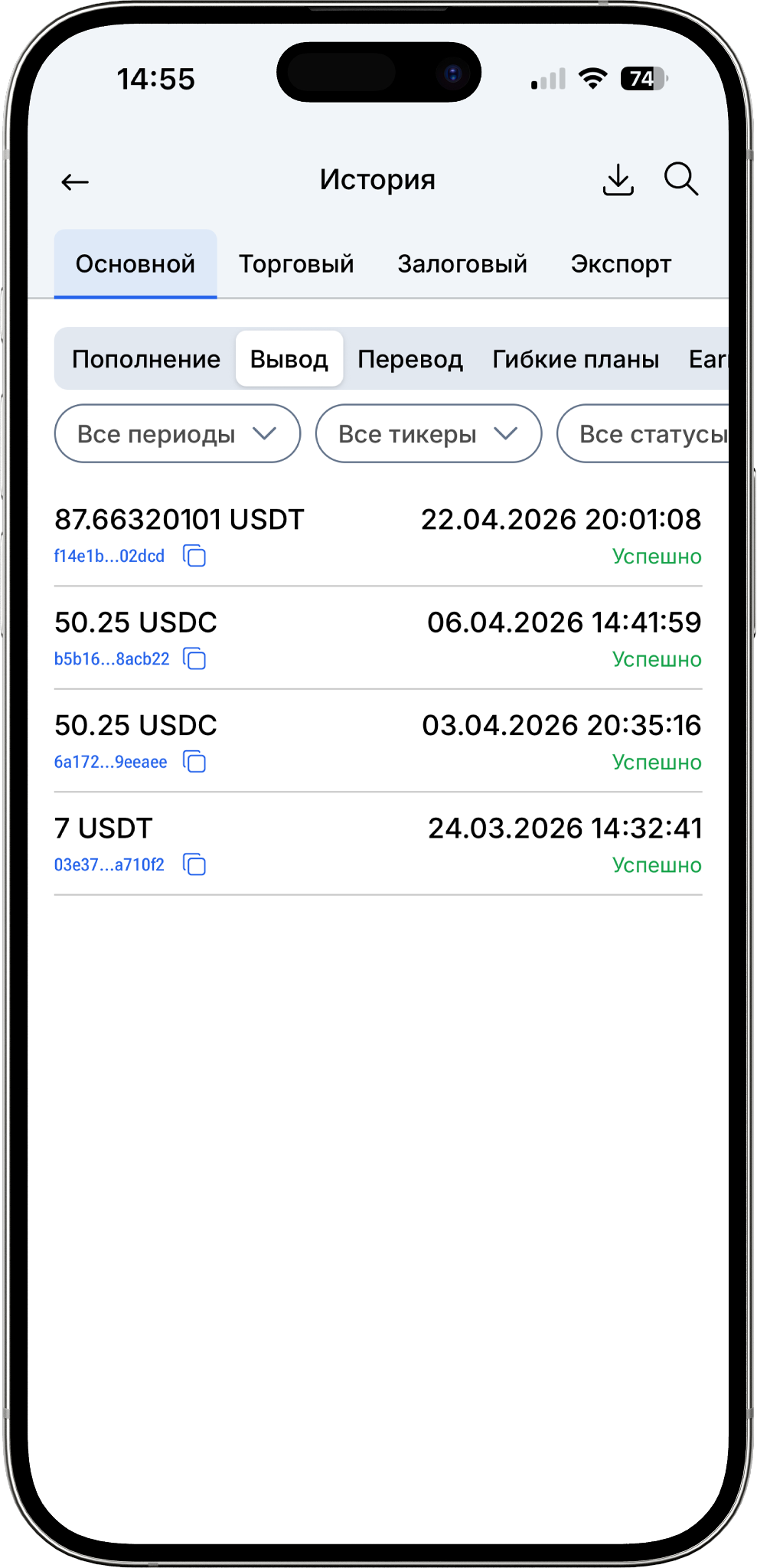 Перед совершением вывода заранее убедитесь, что желаемый актив находится у вас на "Основном" балансе. Перевод между балансами осуществляется вручную с помощью кнопки "Трансфер" во вкладке "Кошелек".