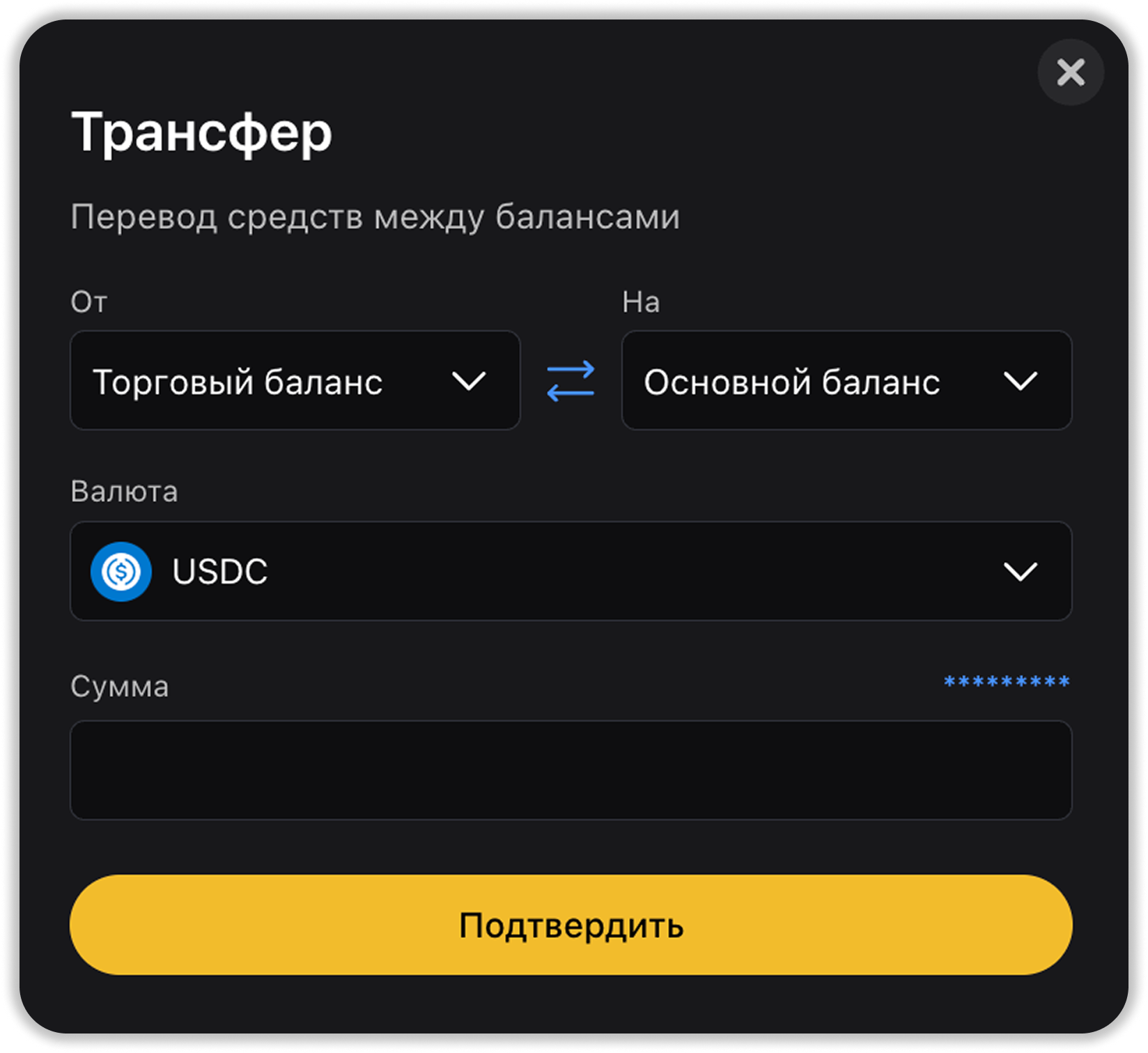 Выберите актив, которую хотите перевести. Затем выберите из выпадающего списка перевод с "Торгового" или "Залогового" балансов на "Основной", укажите сумму активов для перевода и нажмите "Подтвердить". Ваш запрос будет выполнен мгновенно.