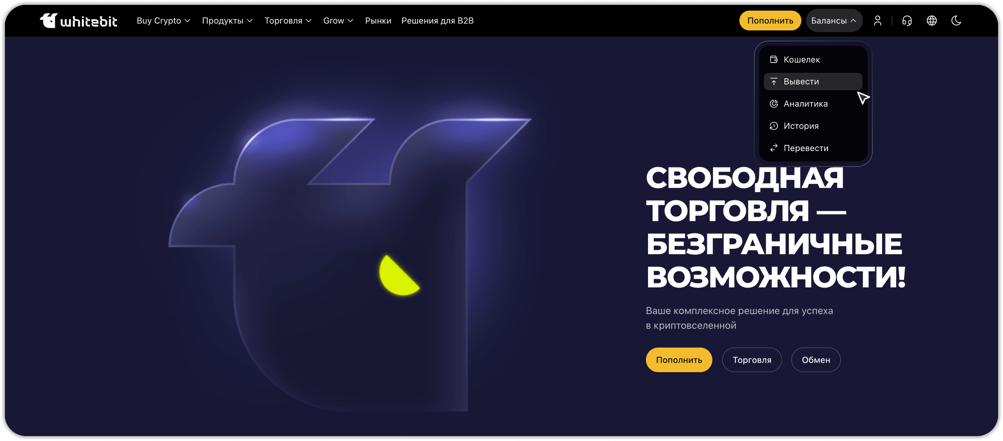Когда средства уже находятся на "Основном" балансе, можно приступать к самому выводу. Давайте пошагово разберем, как вывести средства с WhiteBIT на другую платформу на примере монеты Tether (USDT).
