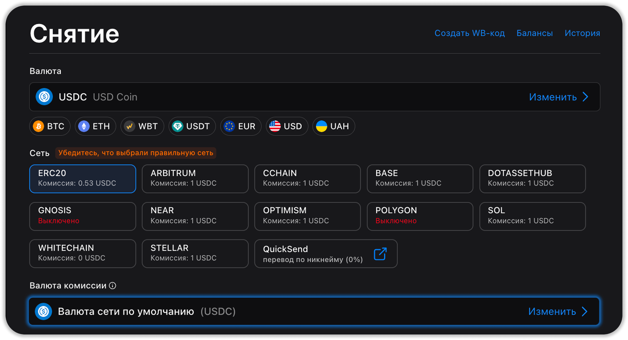 Обратите внимание: вы можете выбрать валюту, в которой будет снята комиссия за вывод средств. Для этого следуйте инструкциям: