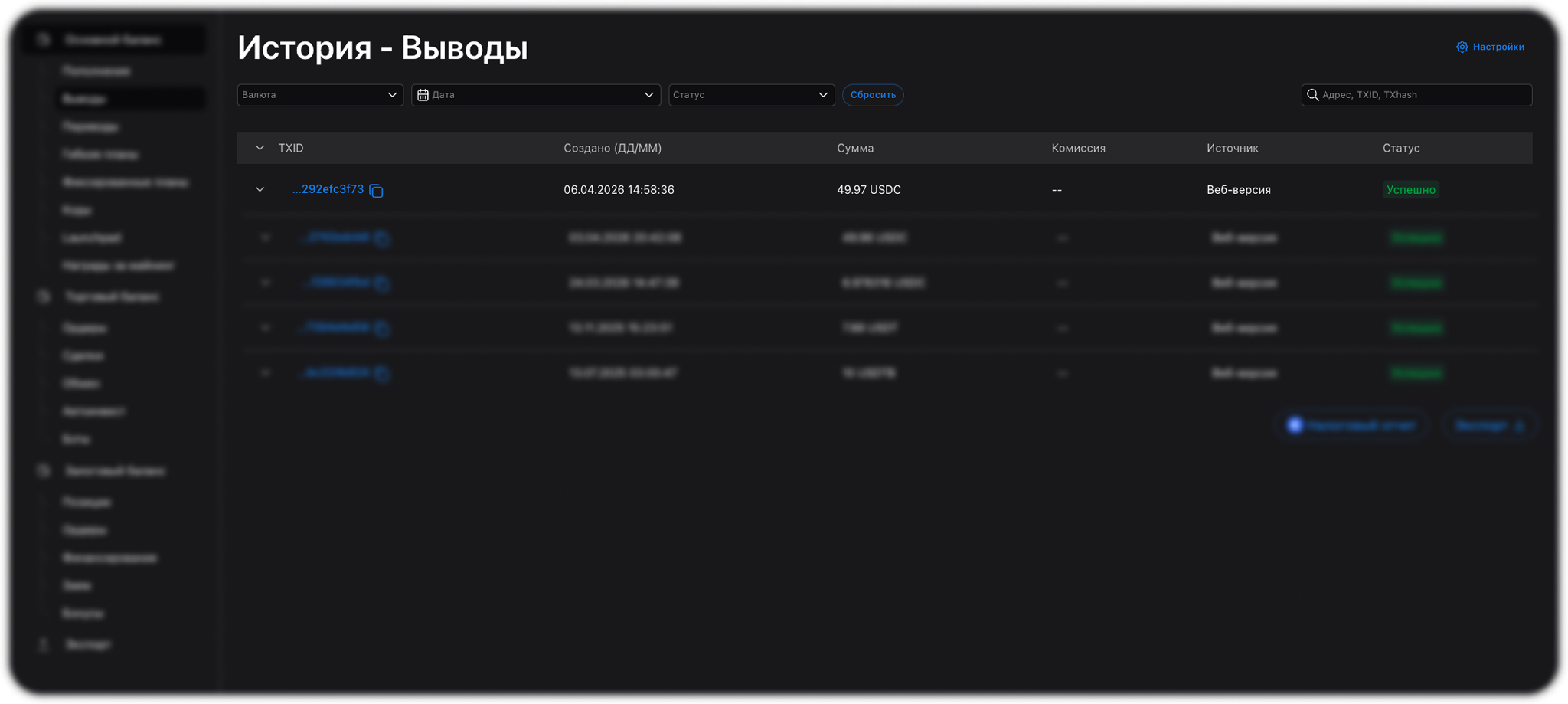 Любой вывод в вашем WhiteBIT-аккаунте отображается в "Истории" во вкладке "Выводы", а средства снимаются с "Основного" баланса.