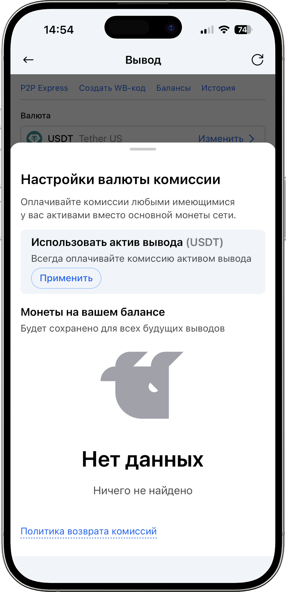 Например, вы хотите осуществить вывод ВТС через сеть BTC, где стандартная комиссия списывается в ВТС. Однако вы решили выбрать оплату комиссии в USDT, доступных на вашем балансе. В этом случае USDT конвертируется в ВТС по курсу Обмена для оплаты комиссии вывода. Вы получаете выбранное количество ВТС, а комиссия списывается с вашего баланса в USDT.