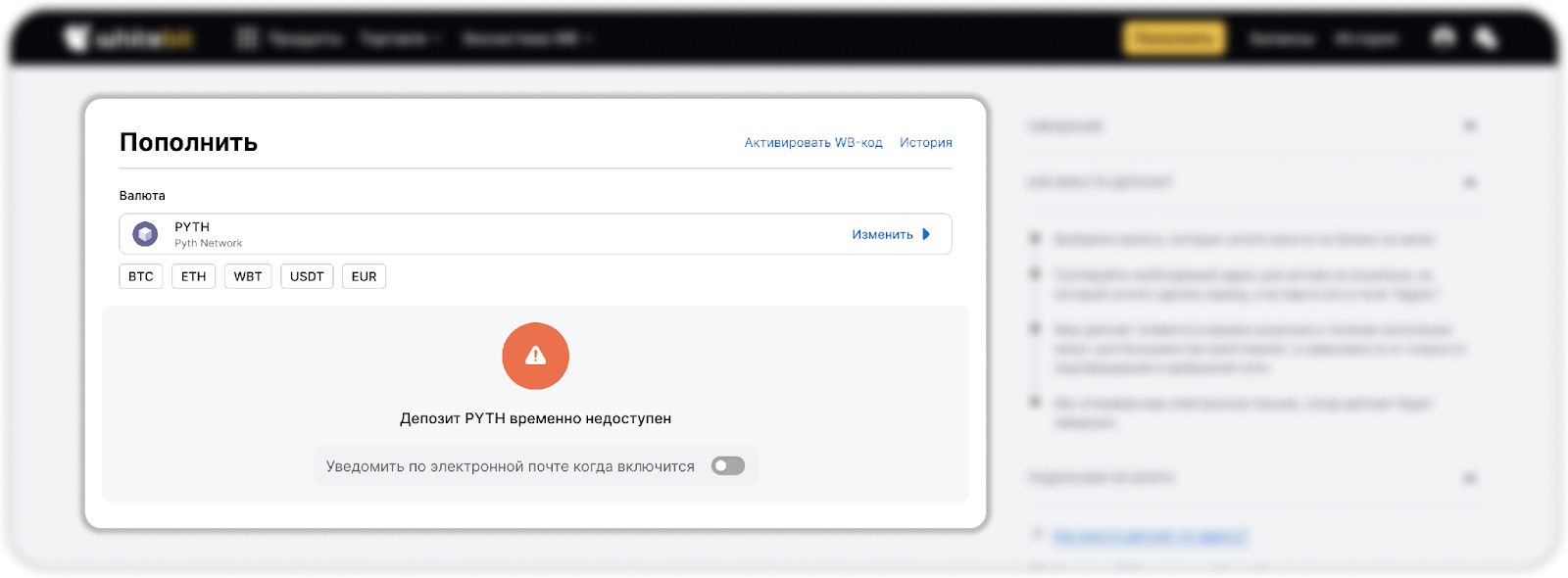 - Нажать на “Пополнение”, после чего в новом окне появится информационное сообщение, что пополнение актива временно недоступно.