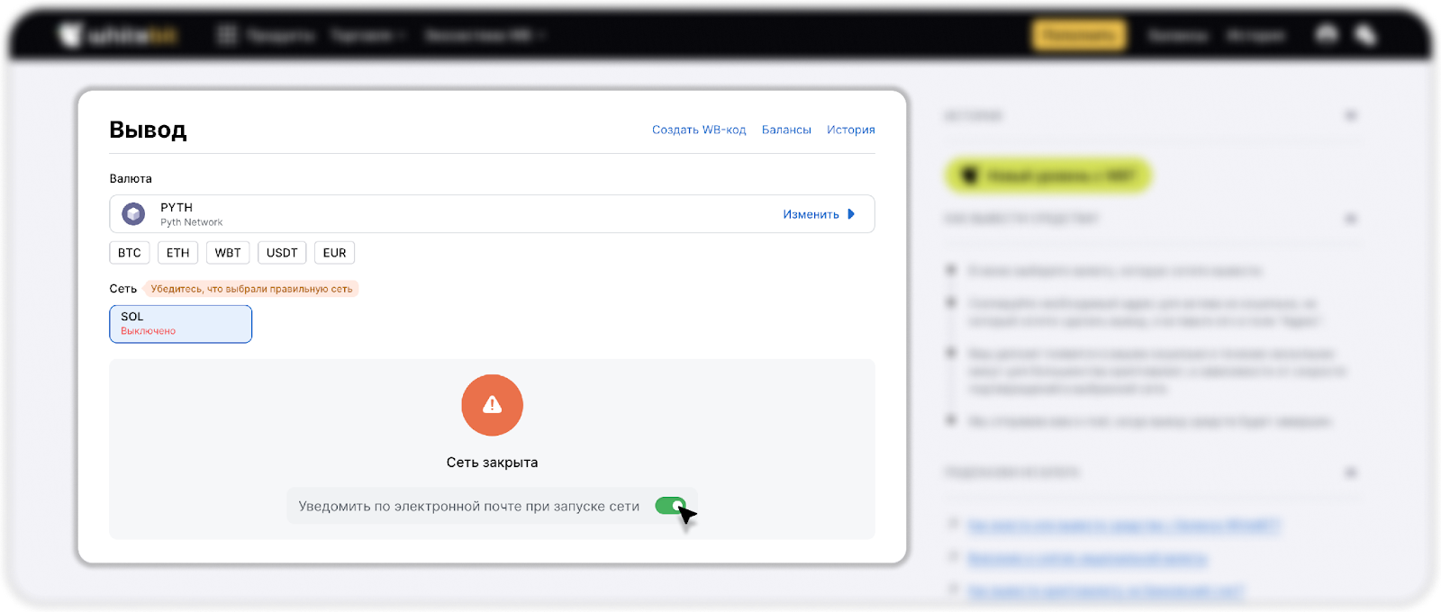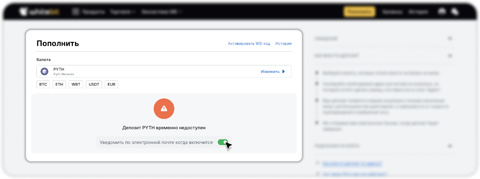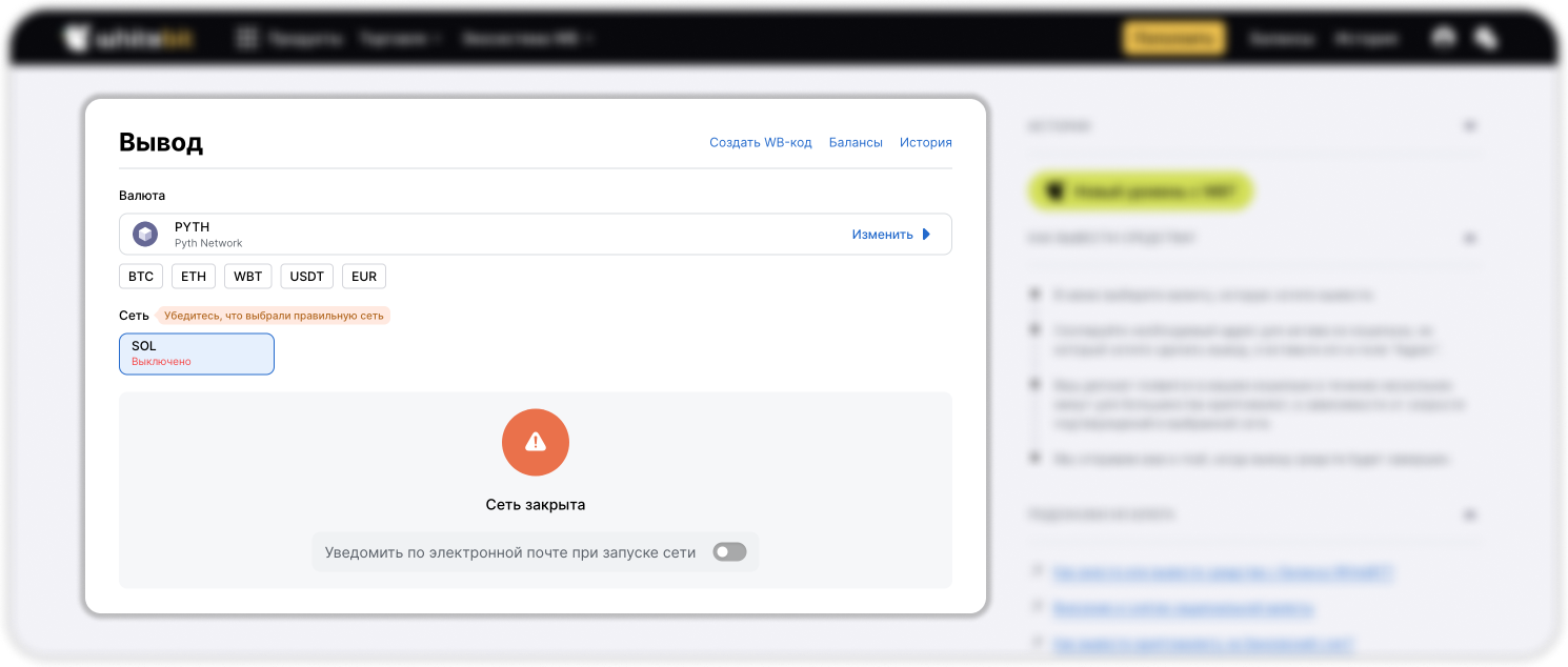 Основным источником информации о доступности того или иного функционала или актива является наш Telegram канал “WhiteBIT Notifications”. Мы настоятельно рекомендуем подписаться на этот канал, чтобы иметь доступ к актуальной информации на нашей бирже.