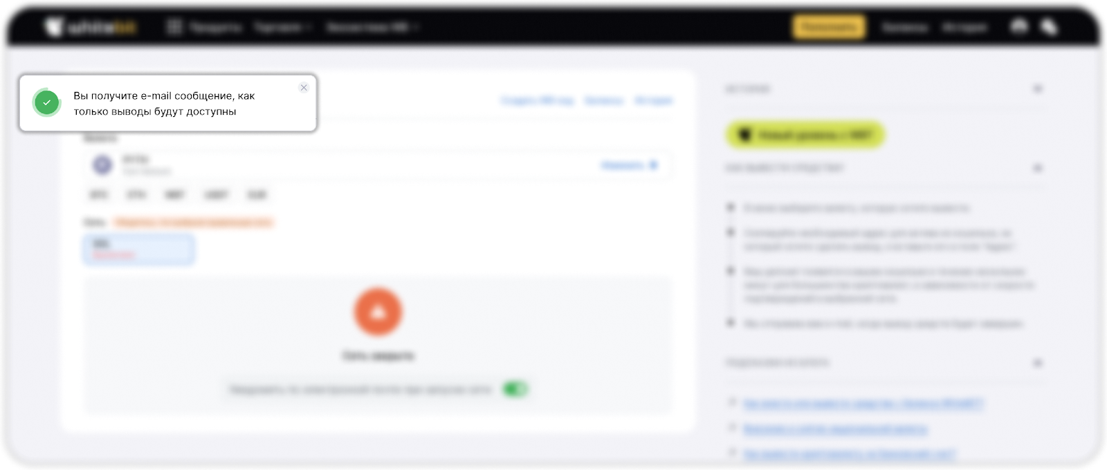 - Если ползунок активирован, после открытия функционала снятия средств данной валюты, вы получите соответствующее письмо на вашу почту, привязанную к аккаунту на бирже.