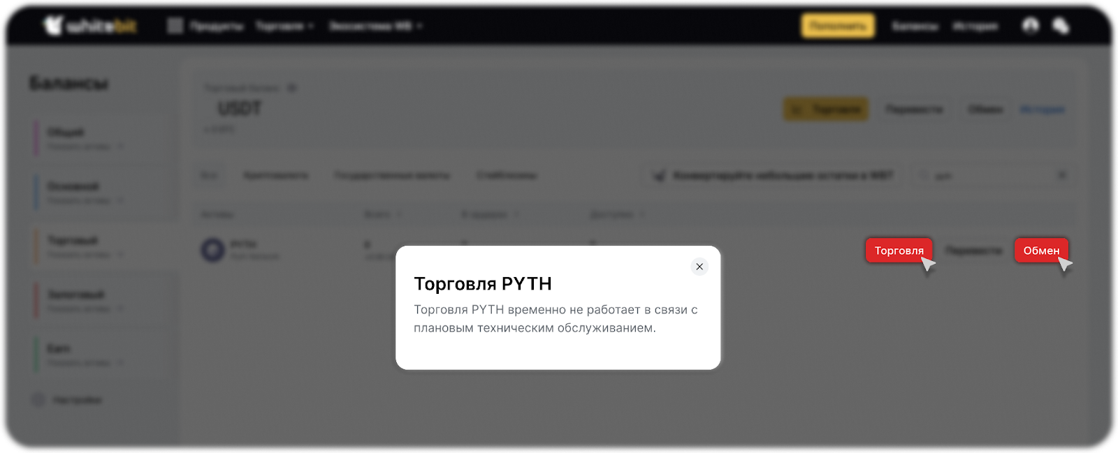 Обмен или торговля актива закрыта на техническое обслуживание