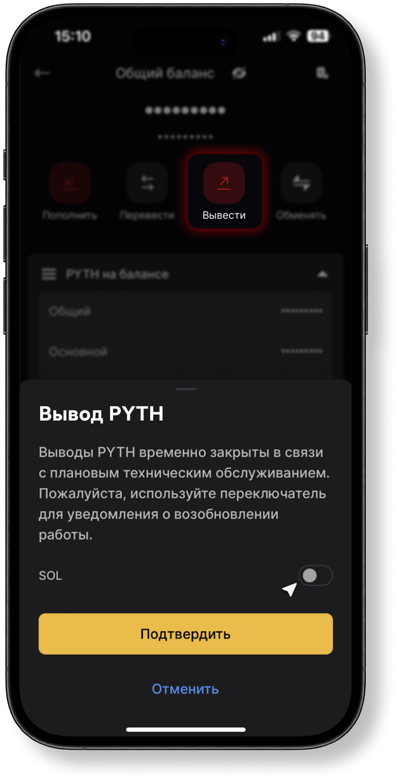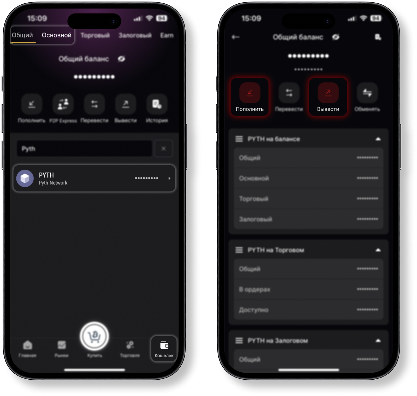 Если для определенного актива ограничивается функционал пополнения баланса и снятия средств, то в разделе “Кошелек”-“Общий” или “Основной” баланс при выборе тикера соответствующей валюты, кнопки “Пополнить” и “Вывести” становятся красными.