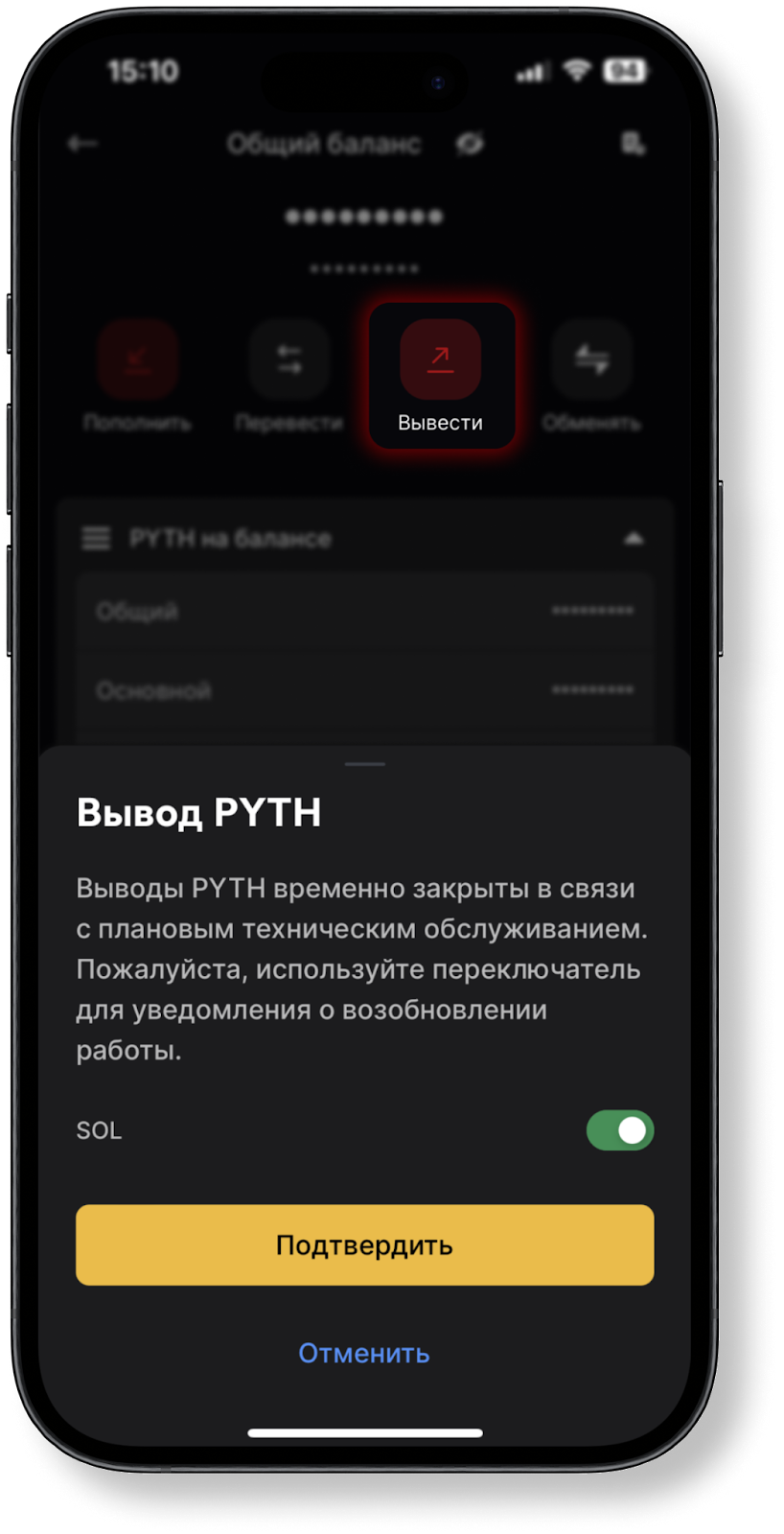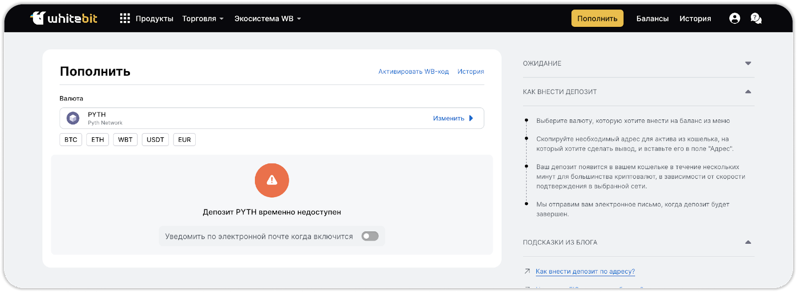 Вы можете узнать о доступности депозитов и выводов актива, нажав на кнопку “Пополнение”/“Вывести” на странице “Общего” или “Основного” баланса. В случае, если операции недоступны, вы увидите соответствующее уведомление в окне депозита/вывода.