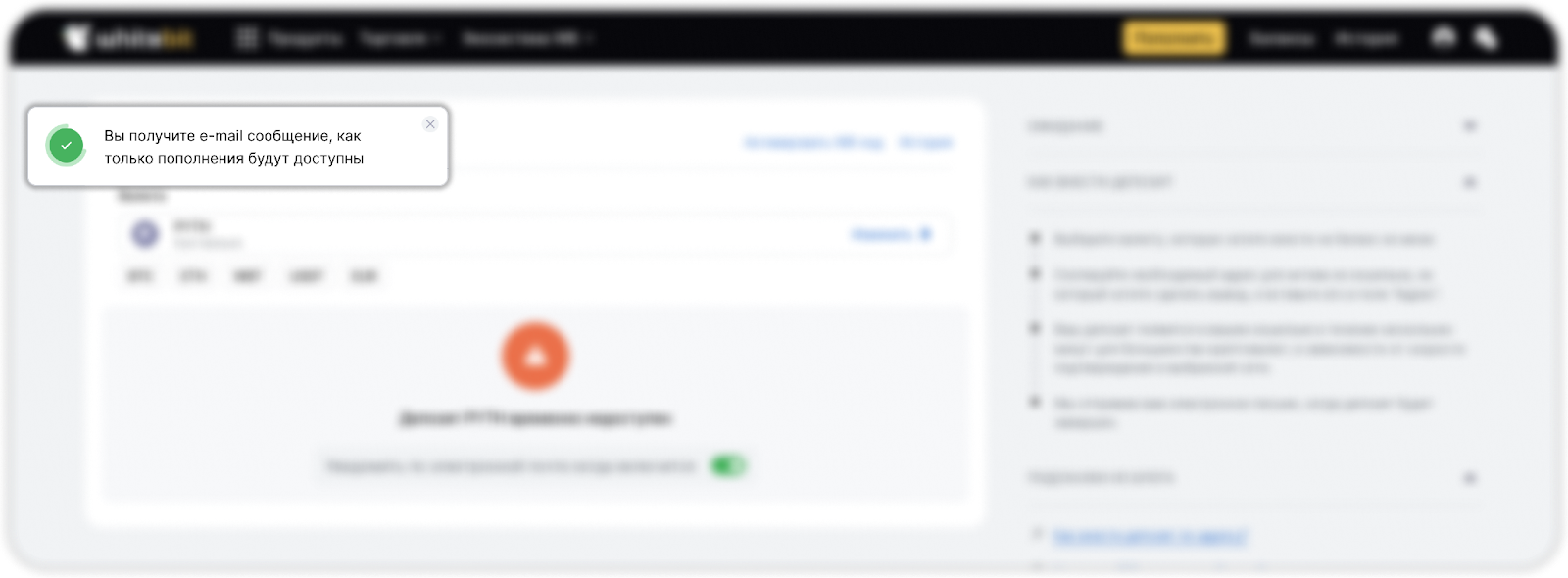 - Система проинформирует вас с помощью всплывающего оповещения, что после открытия функционала пополнения баланса соответствующего актива вы получите письмо на почту, привязанную к вашему аккаунту на бирже.