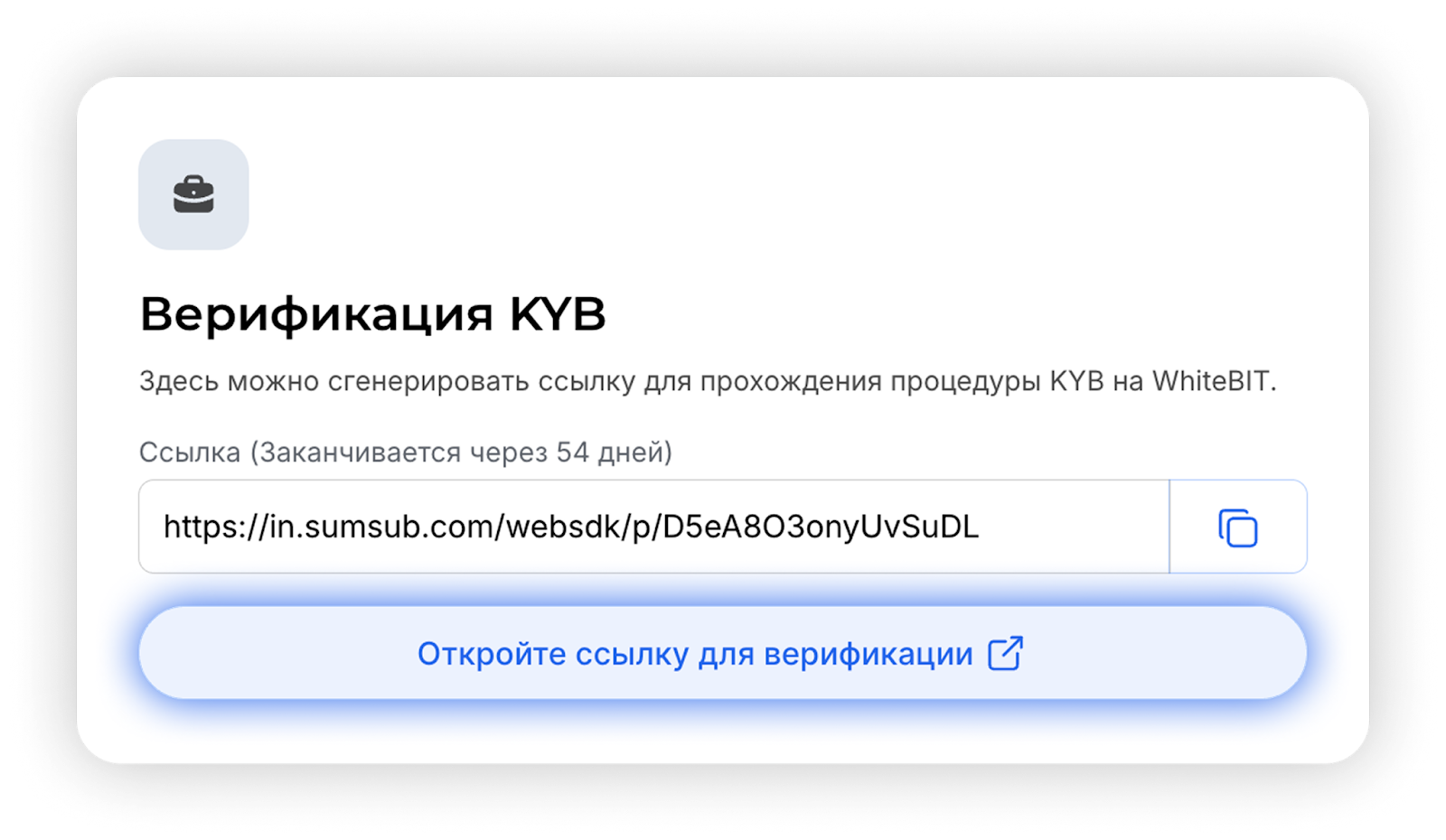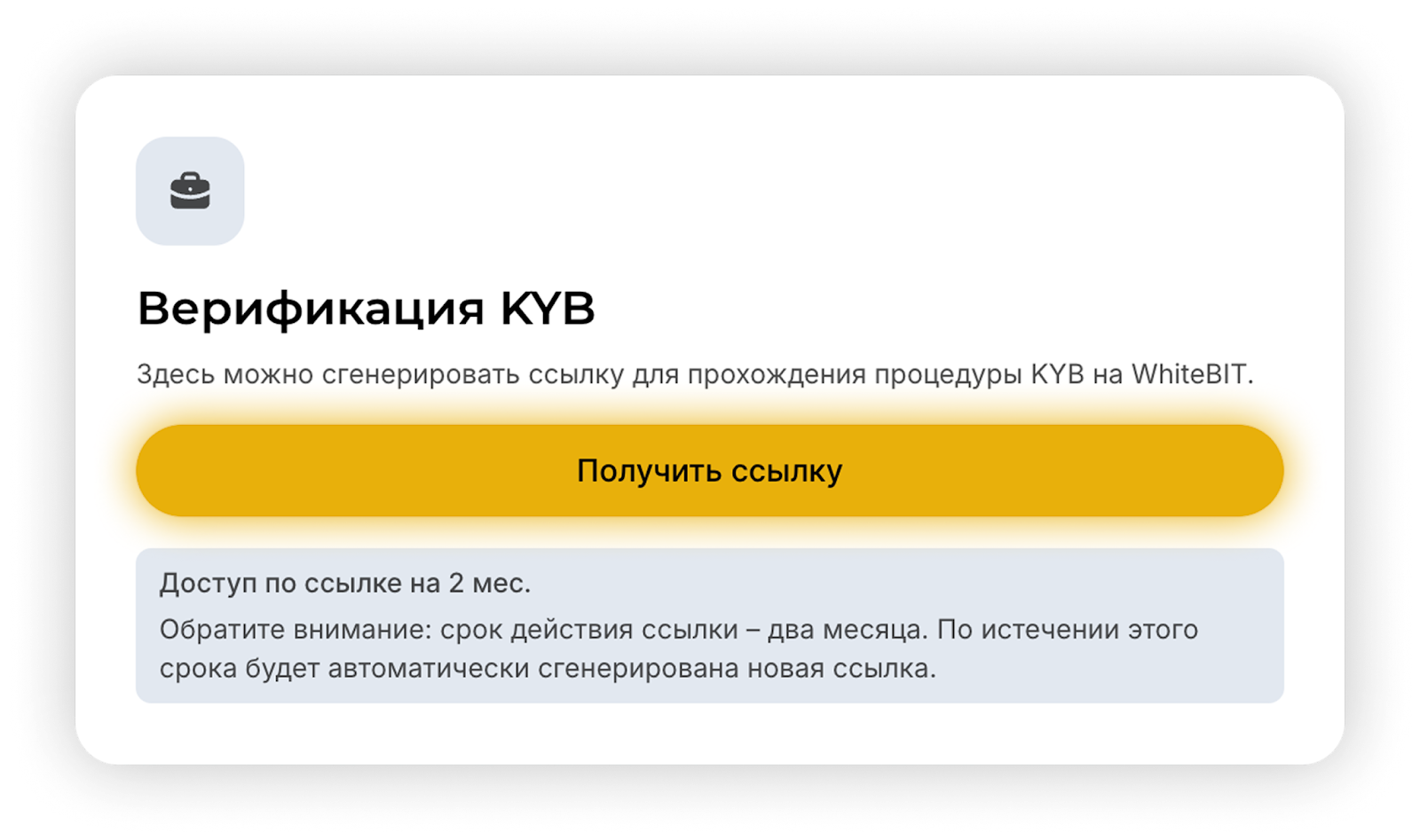- Нажмите на кнопку “Получить ссылку”, чтобы сгенерировать форму для прохождения KYB-верификации.