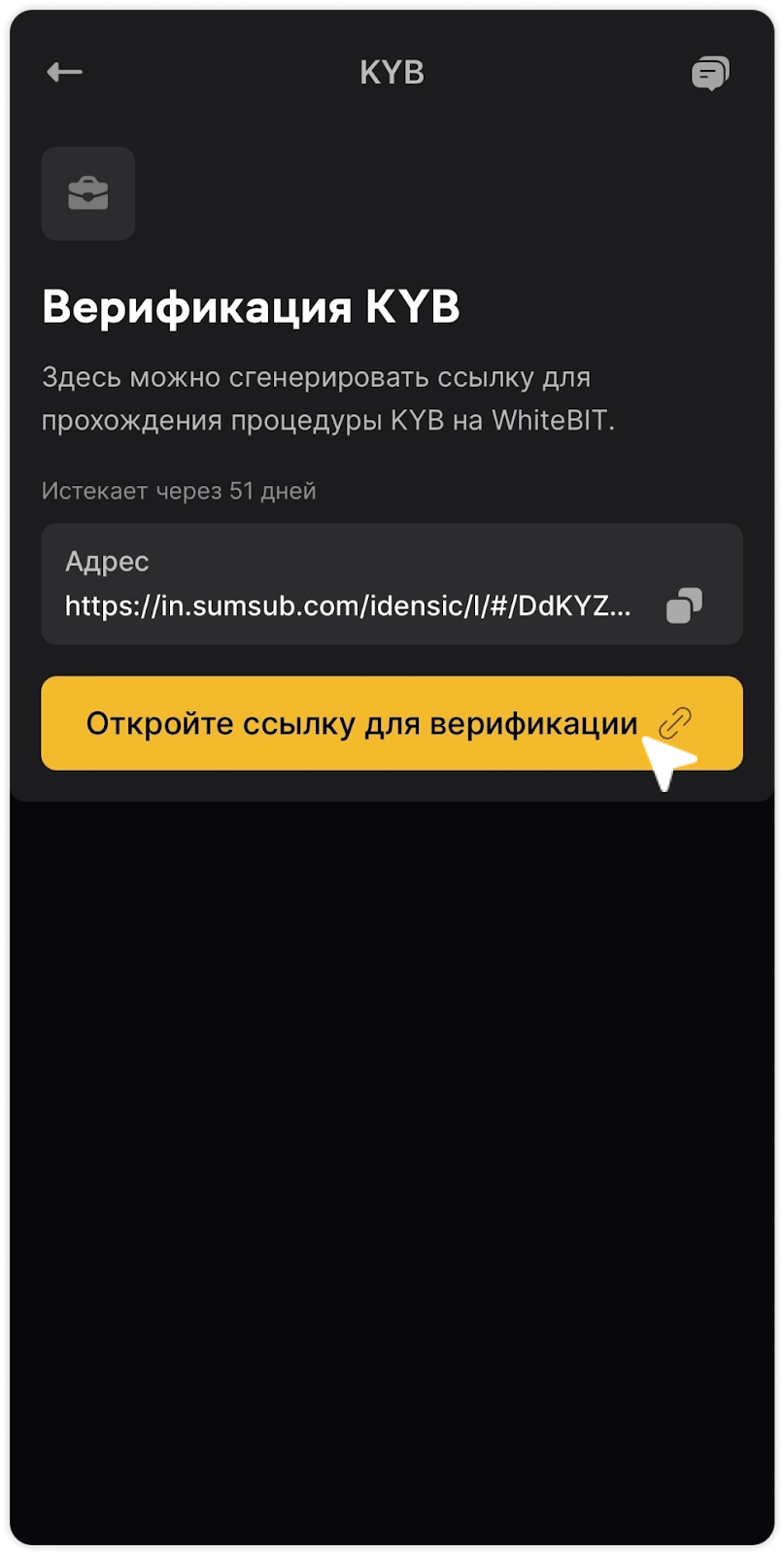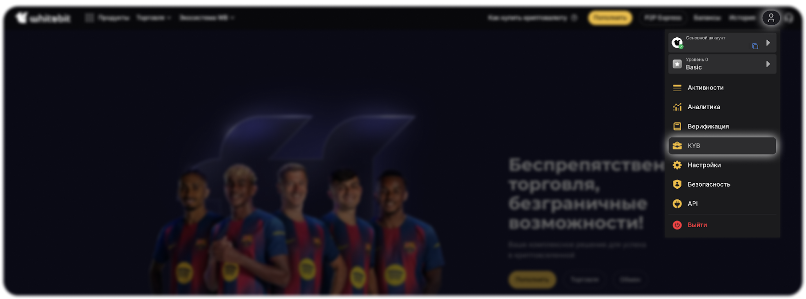 Чтобы пройти KYB-верификацию в мобильном приложении WhiteBIT, пожалуйста, следуйте нижеуказанным инструкциям: