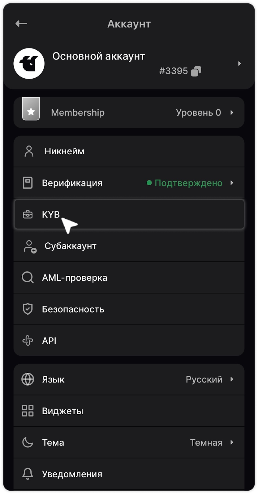 Хотим подчеркнуть, что наличие успешной KYC-верификации является обязательным условием для прохождения KYB-верификации на вашем аккаунте. Вы можете пройти KYC-верификацию, перейдя на вкладку “Верификация”.