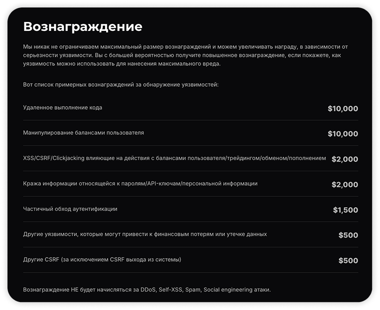 Обратите внимание: биржа самостоятельно определяет уровень риска для каждой сообщенной ошибки после тщательной проверки и подтверждения существования бага или уязвимости. Важно учитывать, что DDoS, Self-XSS, Spam, Social engineering атаки не подлежат вознаграждению.