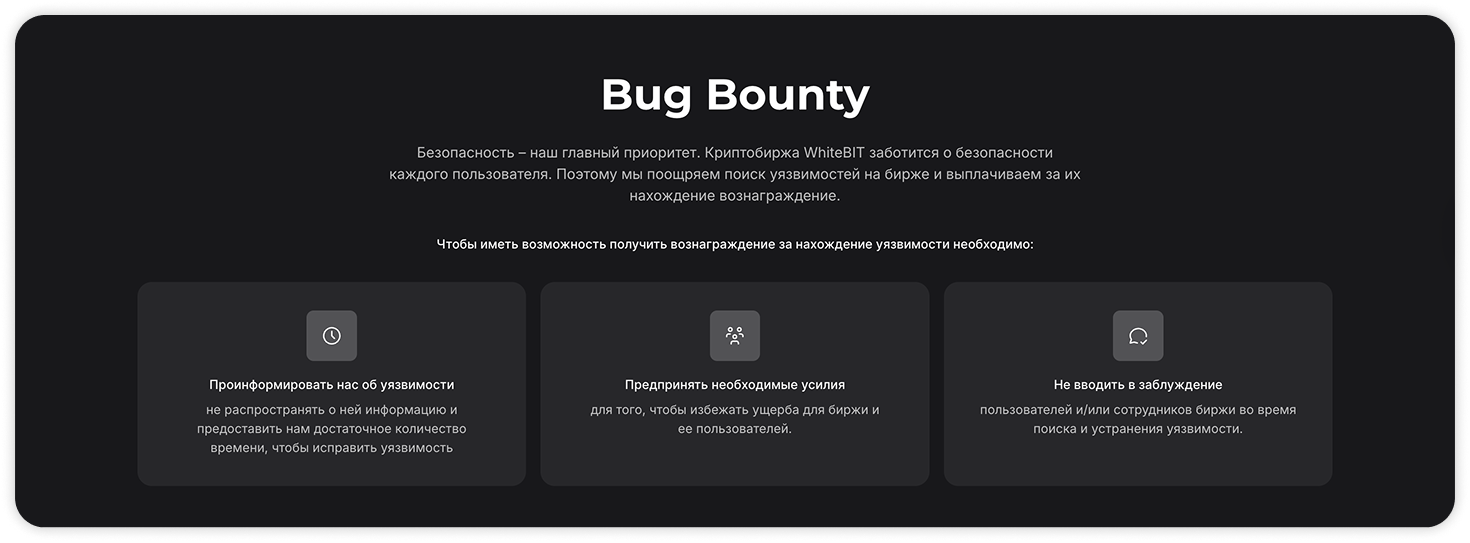 Баг баунти (Bug Bounty) — это активность, которая позволяет получить вознаграждение за обнаружение различных уязвимостей на бирже. Поскольку безопасность и надежность — основные принципы работы биржи WhiteBIT, была реализована программа Bug Bounty, направленную на поиск ошибок и уязвимостей.