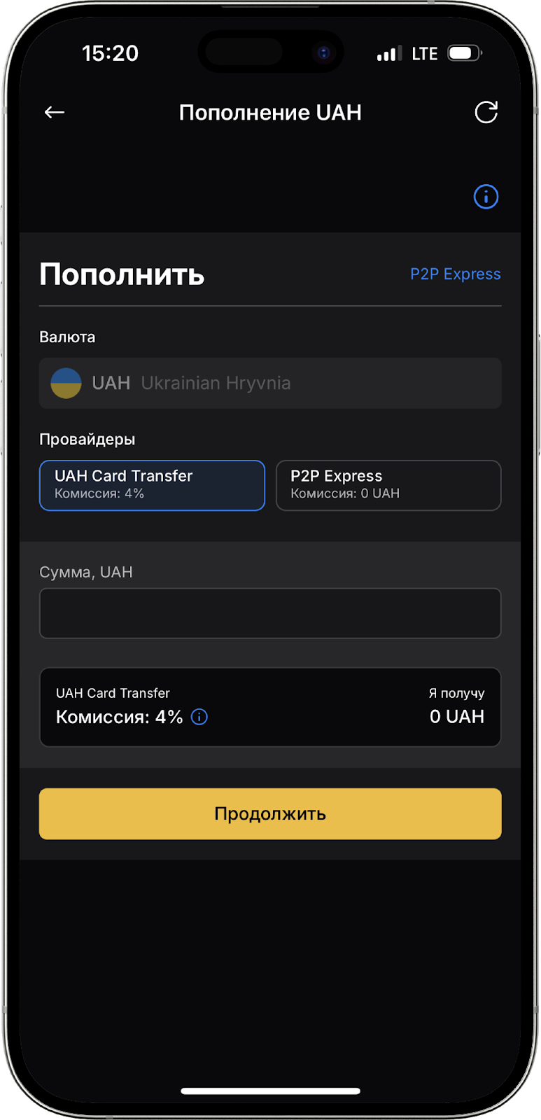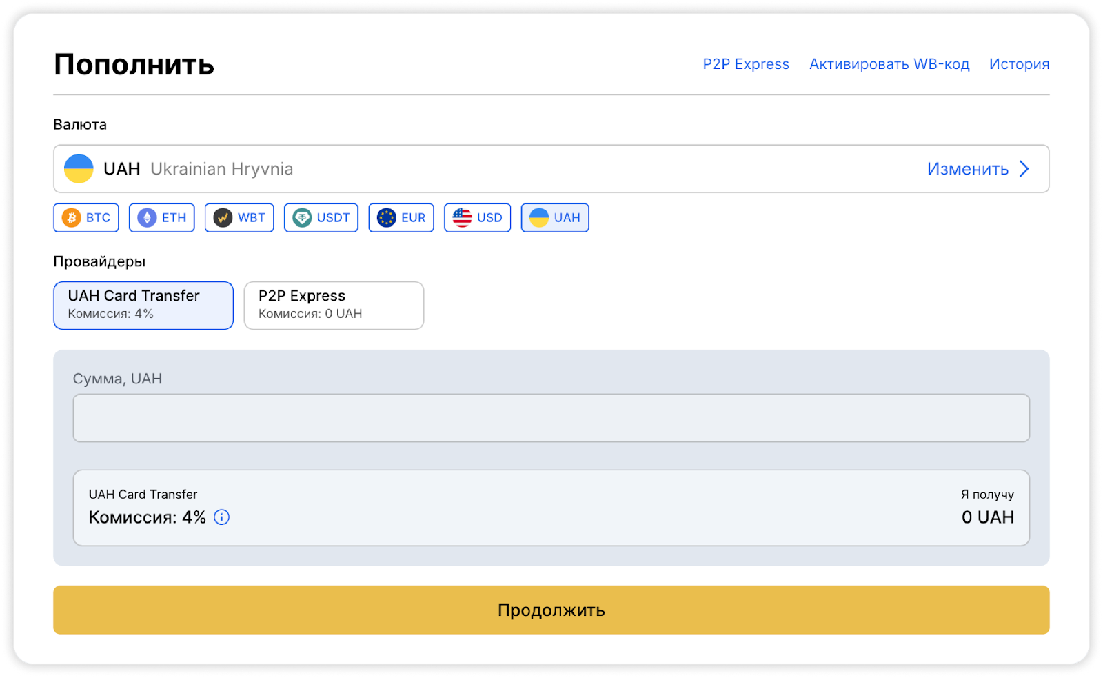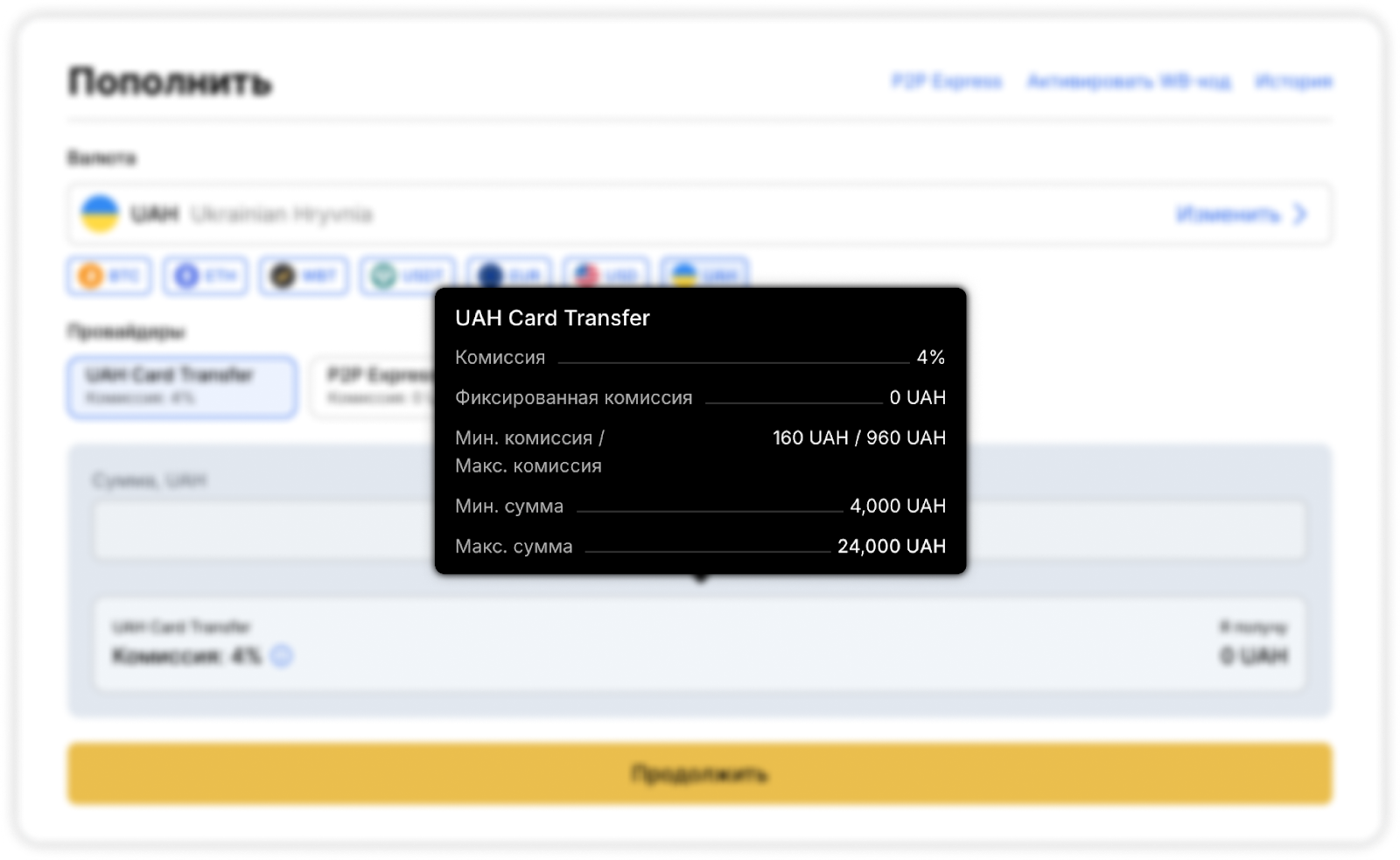 В открывшемся окне выберите Card Transfer из списка провайдеров. Укажите сумму вашего пополнения.