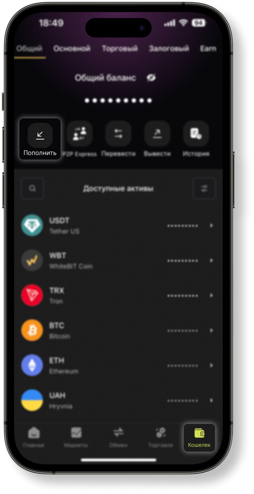 Откройте главную страницу приложения WhiteBIT и нажмите на кнопку «Пополнение». Вы также можете перейти к форме пополнения через вкладку «Кошелек» — «Пополнить».