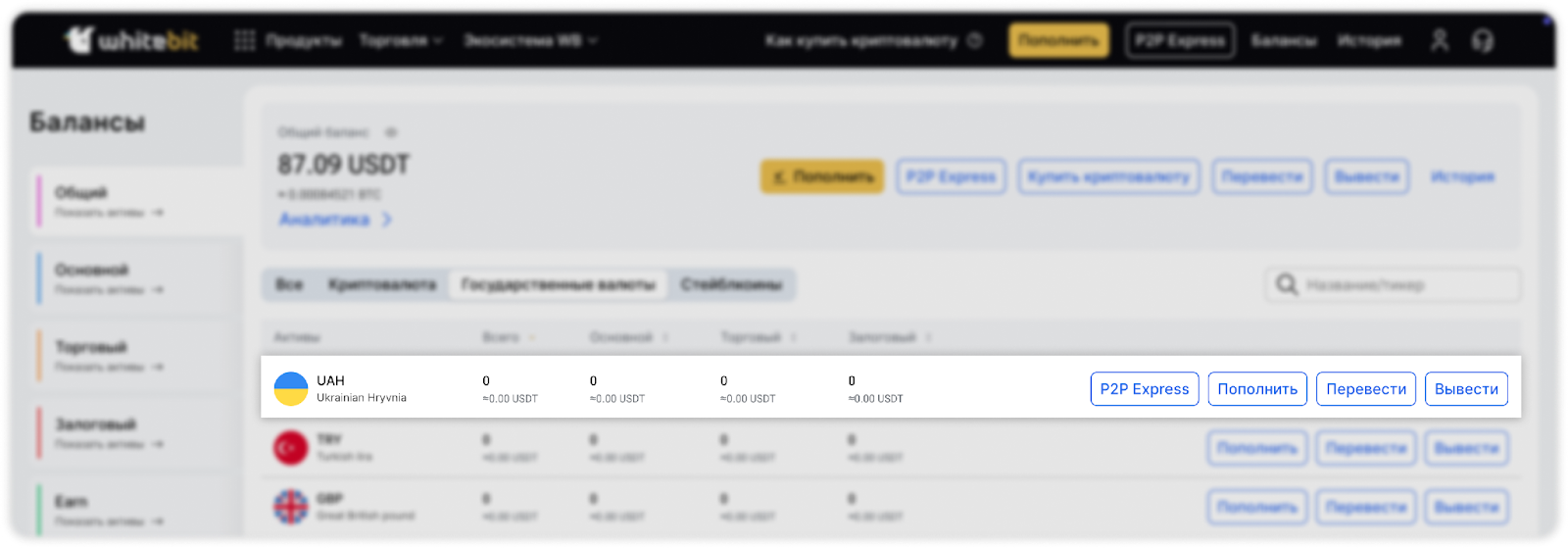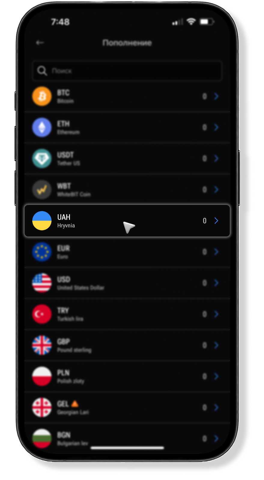 Найдите в списке украинскую гривну (UAH) или введите тикер валюты в строке поиска. Нажмите на кнопку «Пополнить» справа от тикера выбранной валюты.