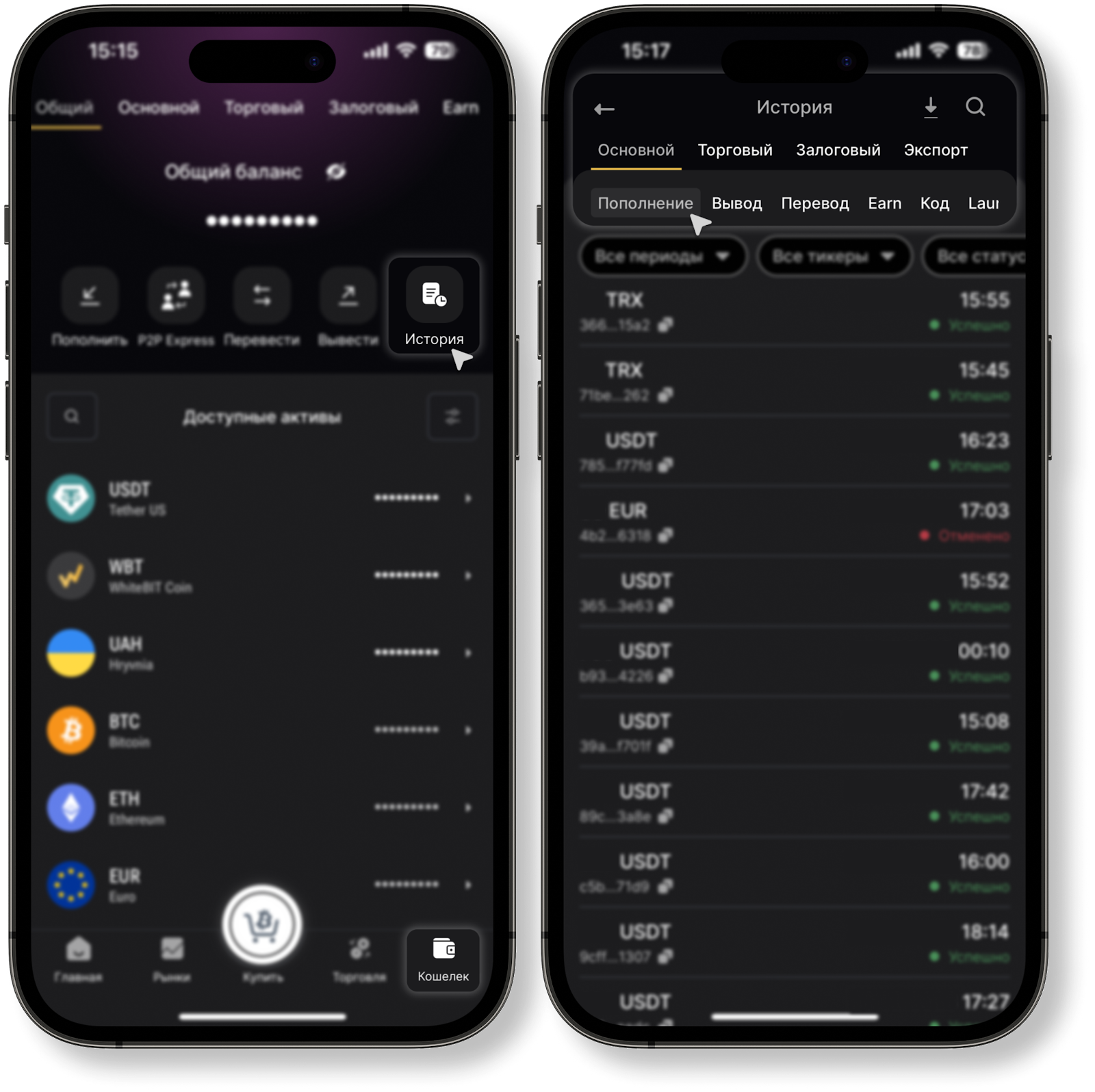Чтобы проверить детали пополнения, перейдите в раздел «Кошелек» в приложении WhiteBIT и нажмите на кнопку «История».