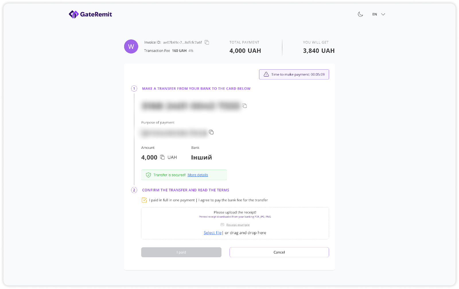 Card Transfer — удобный, быстрый и безопасный способ для пополнения своего баланса в украинской гривне (UAH) и вывода UAH на WhiteBIT. Использовав данную платежную систему, выведенные средства поступят напрямую на указанный вами номер банковской карты в инвойсе.