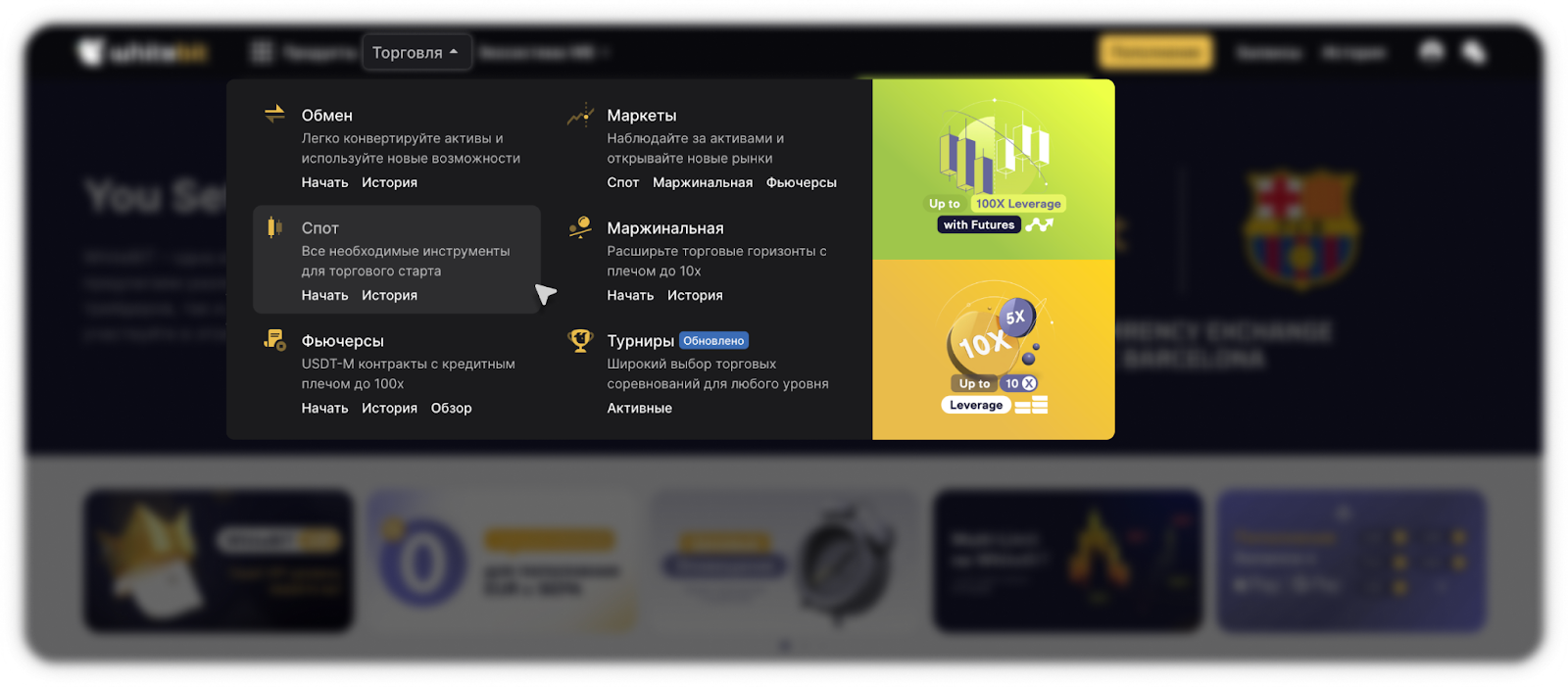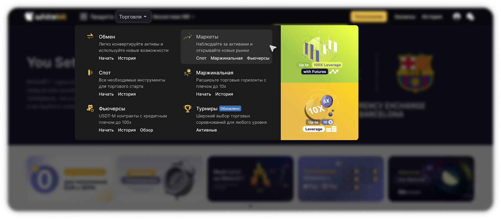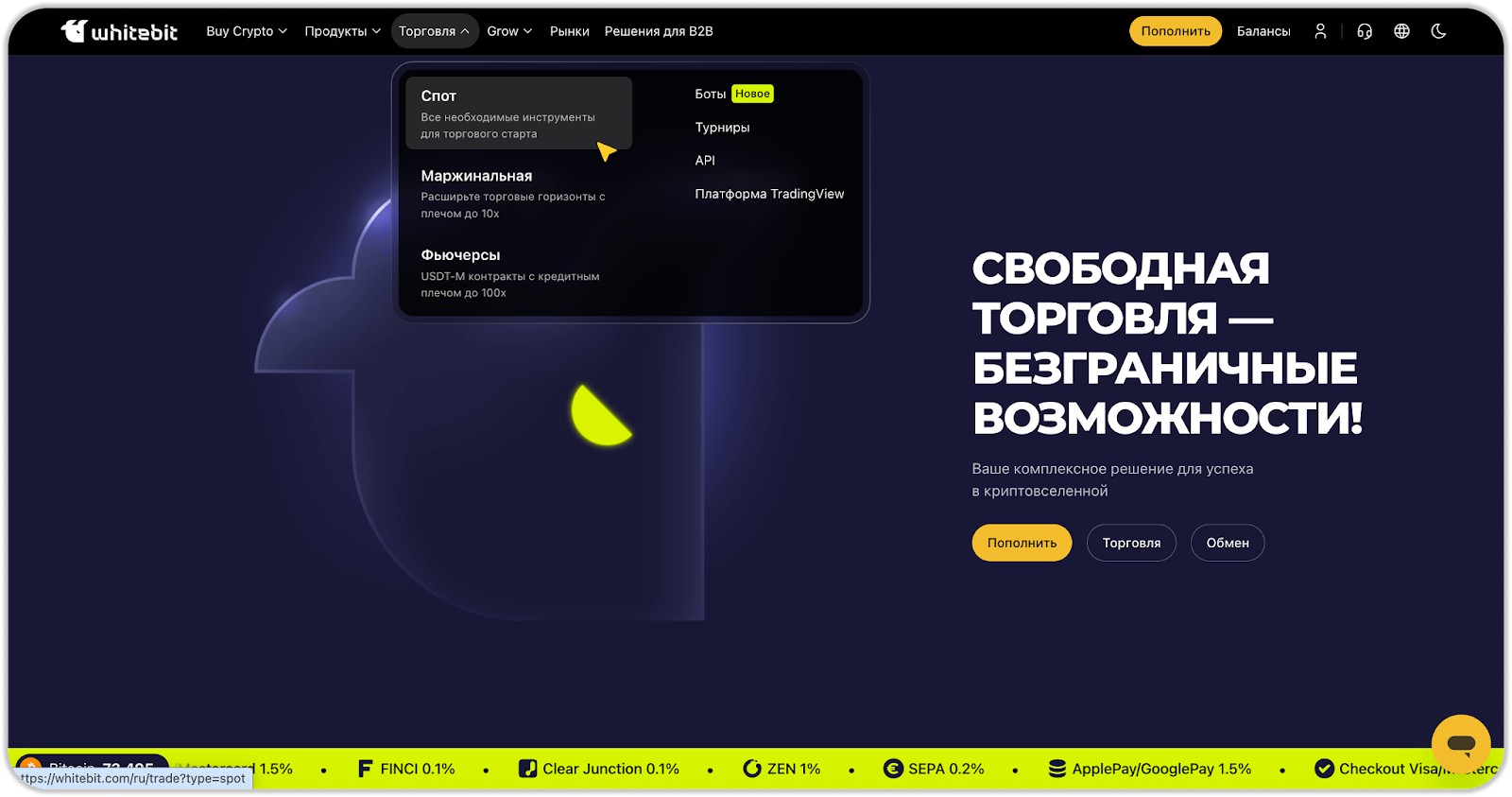 в правом нижнем углу экрана (в приложении WhiteBIT в правом верхнем углу нажмите