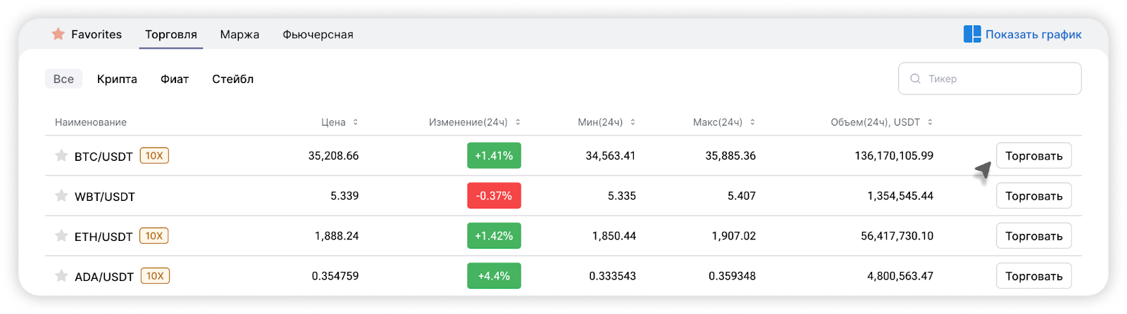 Кроме того, вы можете воспользоваться страницей Маркеты, выбрав пару валют и нажав справа от нее кнопку Торговать.