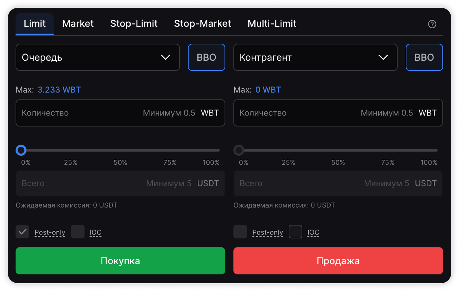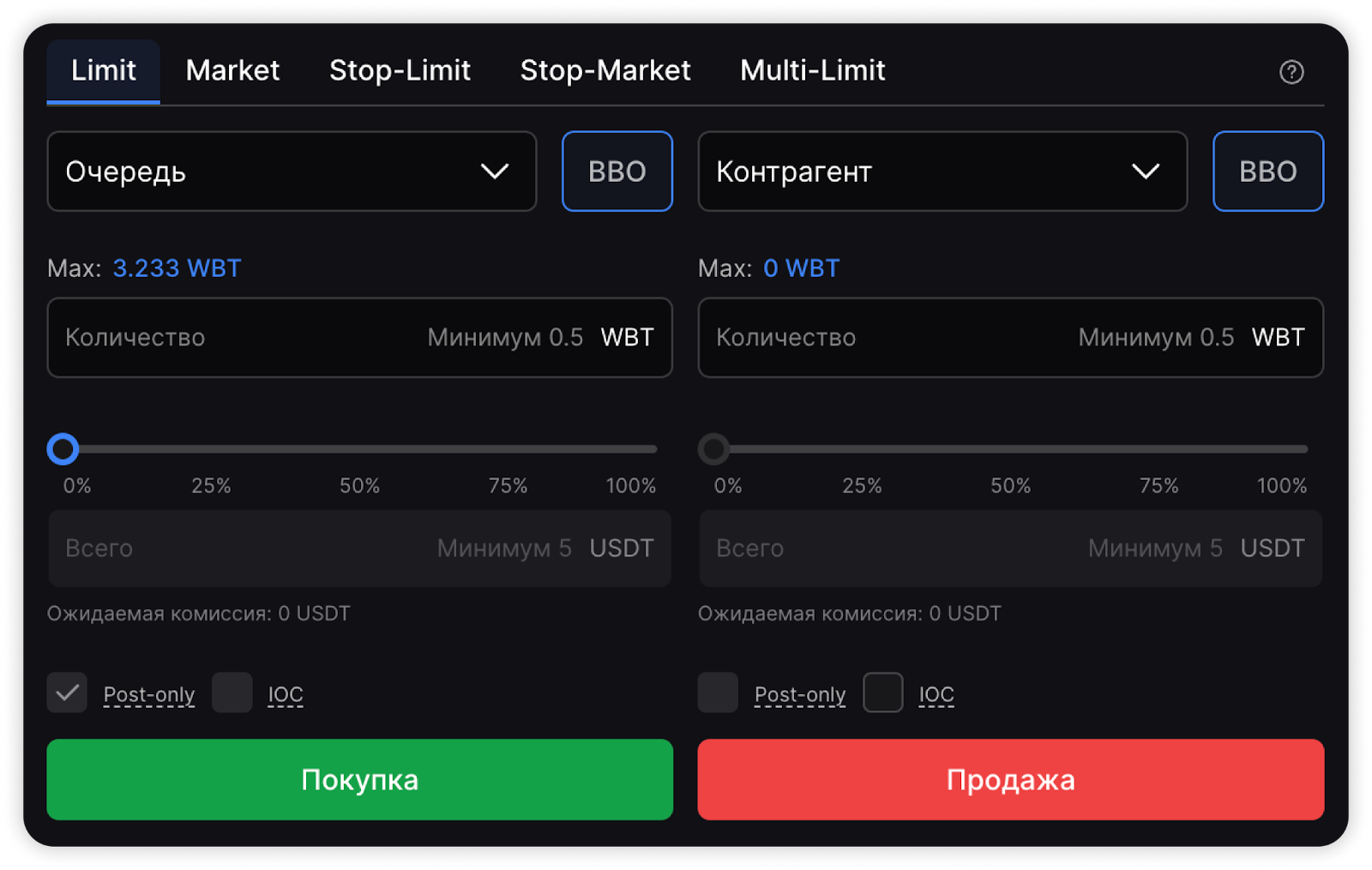 В новом окне справа внизу вы найдете форму для покупки/продажи актива, которая будет отличаться в зависимости от типа ордера: