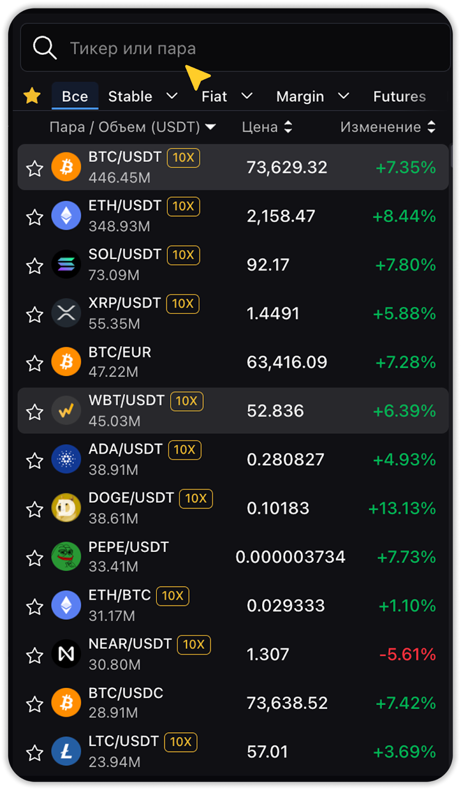 Вы также можете воспользоваться вкладкой «Рынки». Откройте поиск, выберите доступную пару и нажмите на нее. Вы будете перенаправлены на страницу с графиком. Там нажмите кнопку Купить или Продать.