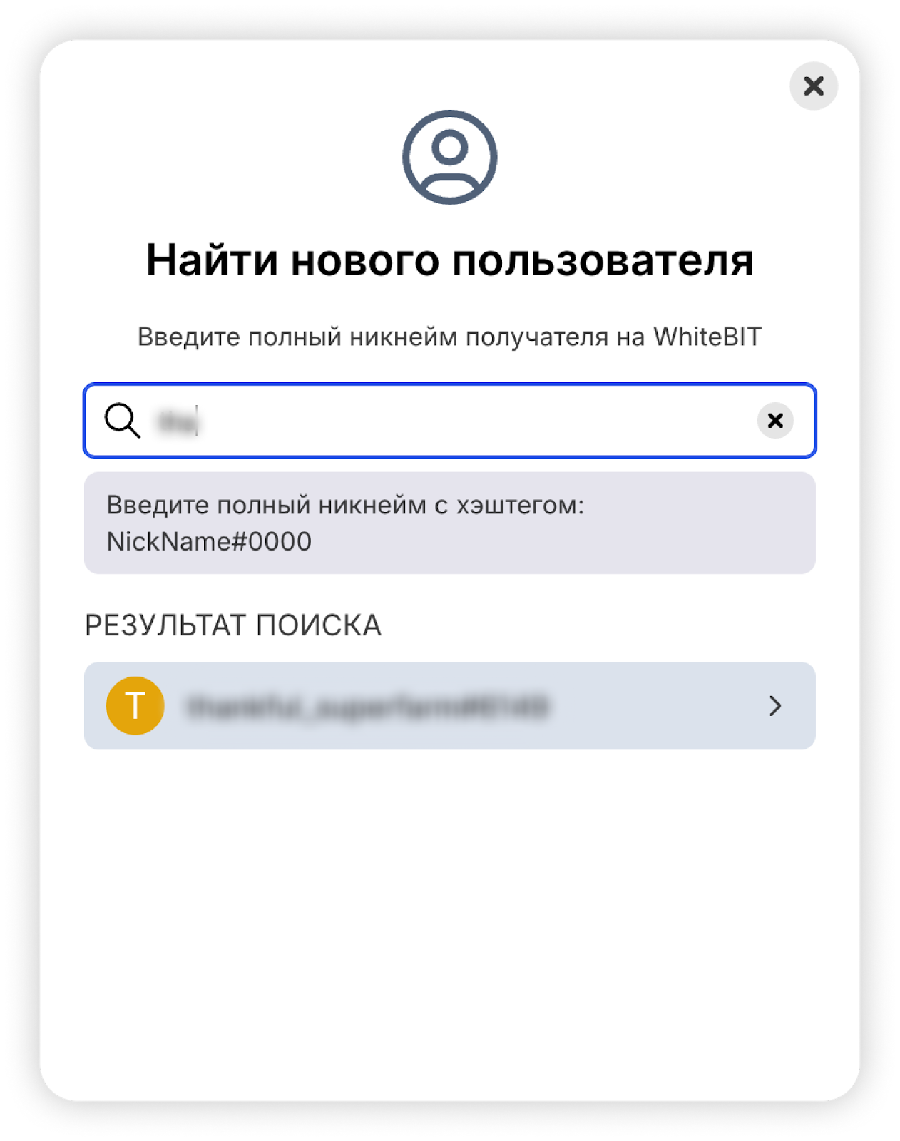 Теперь вы можете искать получателя и отправлять криптовалюту другому пользователю WhiteBIT по никнейму на бирже! Для этого достаточно ввести никнейм в строку поиска и выбрать нужный.