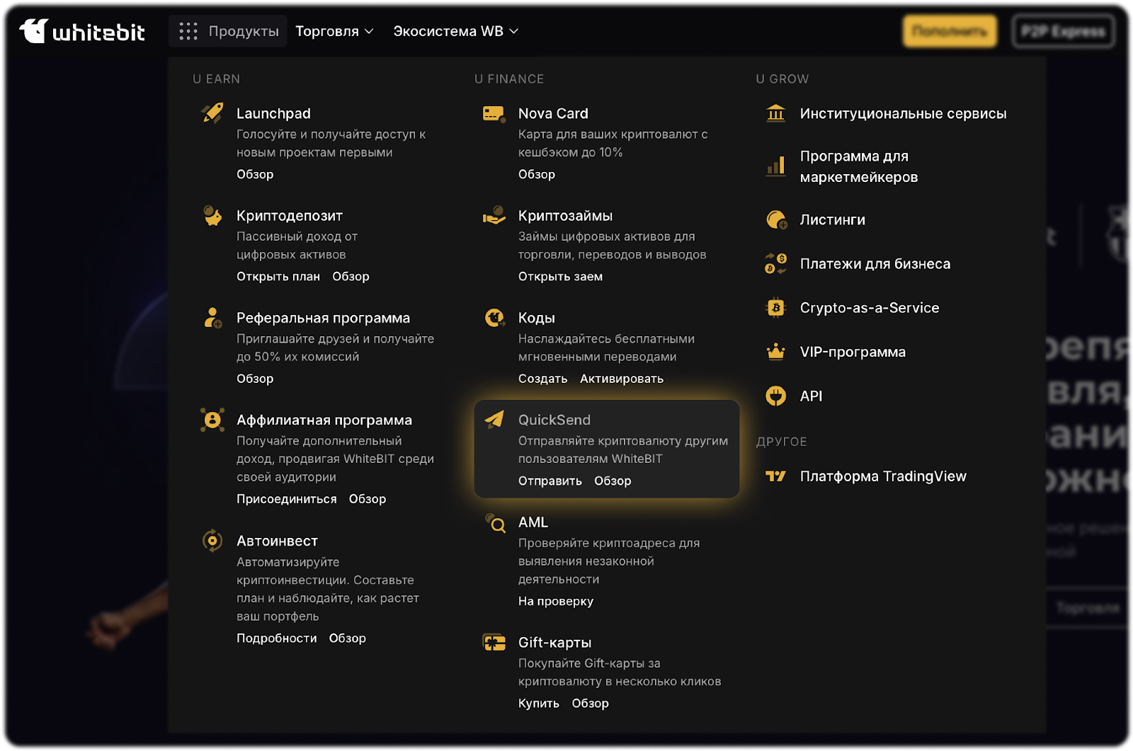 Важным преимуществом функции QuickSend является возможность переводить средства не только между пользователями биржи, но и между пользователями всех проектов экосистемы WhiteBIT, таких как WhiteBIT TR и WhiteBIT Georgia.