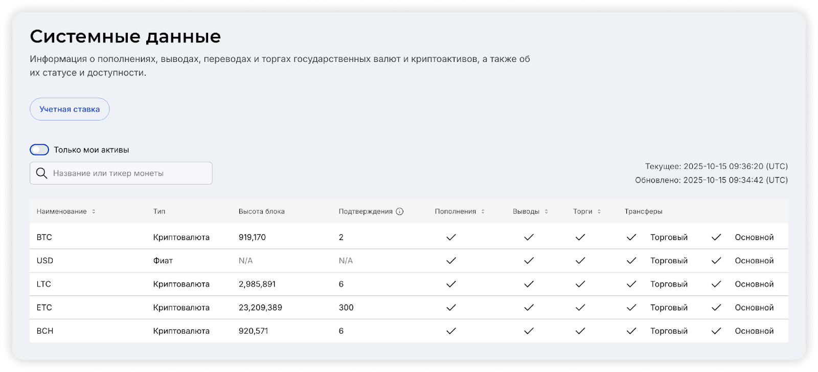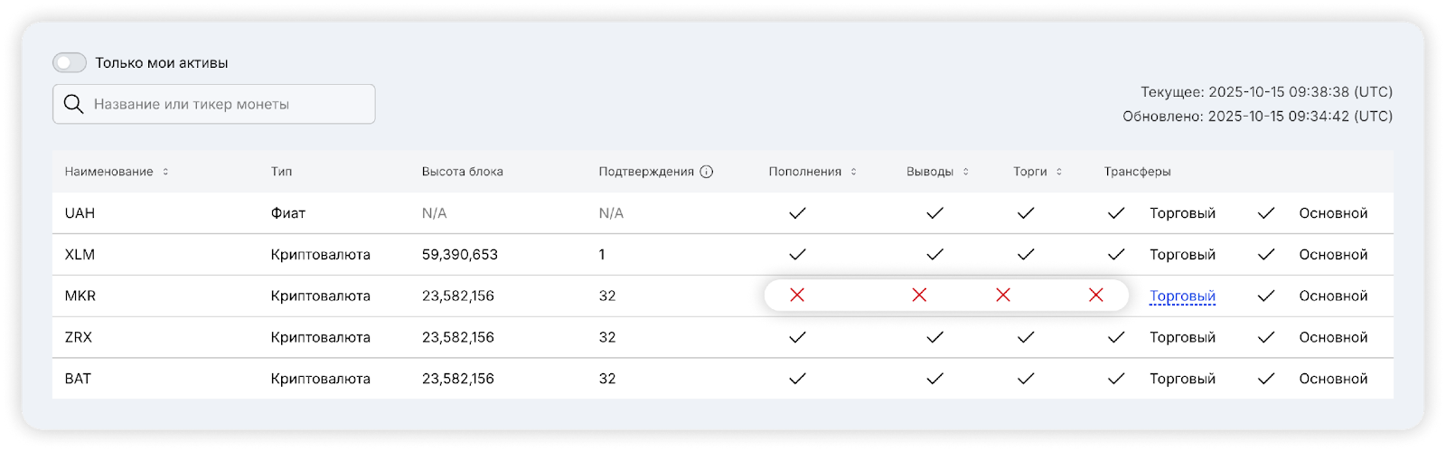 Основную часть страницы занимает детальная информация о валютах, доступных на платформе. Указаны их наименования, типы, высота блока и подтверждения в сети. Также отображается актуальный статус операций, включая пополнения, выводы, торги и трансферы. Этот раздел удобен для мониторинга доступности услуг по каждому активу.