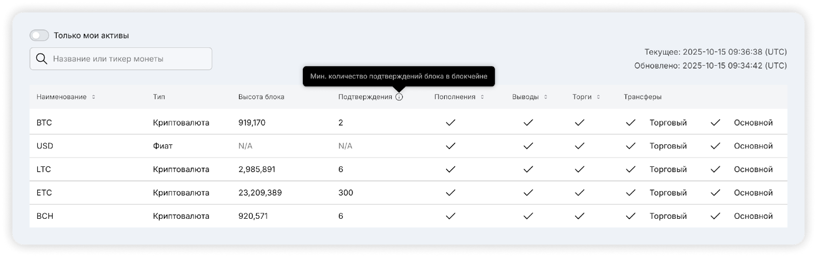Рассматривая список валют на странице, вы можете увидеть данные о текущей высоте блока монеты в сети и необходимом количестве подтверждений для зачисления депозита этого актива.