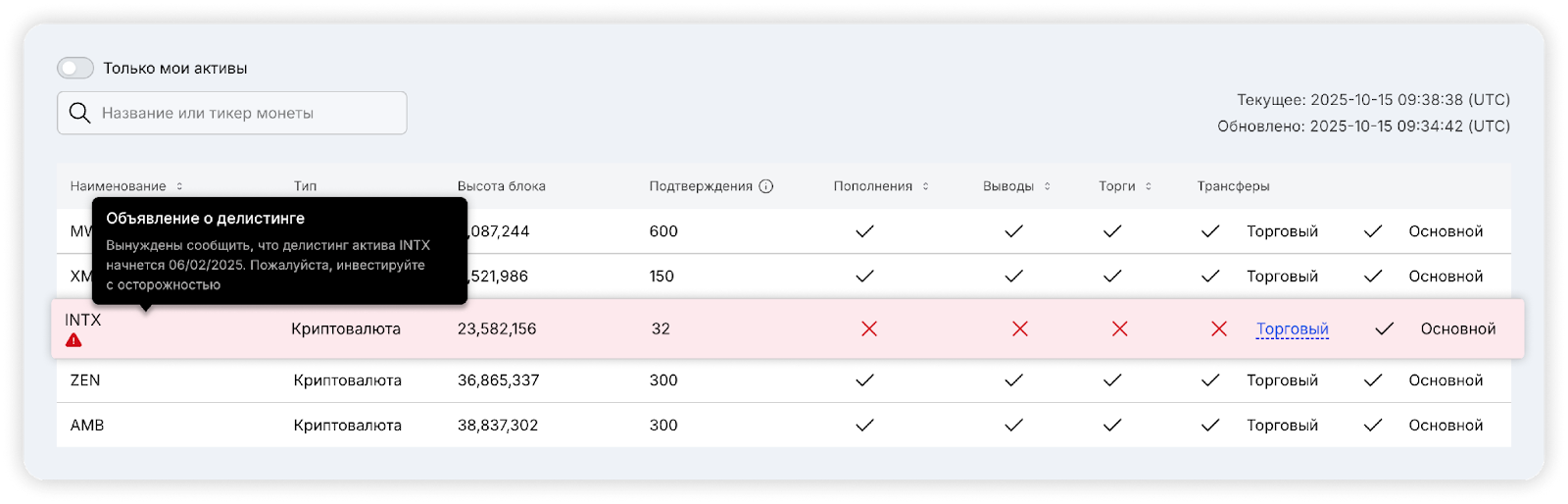 Также тут также можно найти дополнительную информацию по отдельным валютам. Например, если актив находится в процессе делистинга, на странице будет отображено соответствующее уведомление.