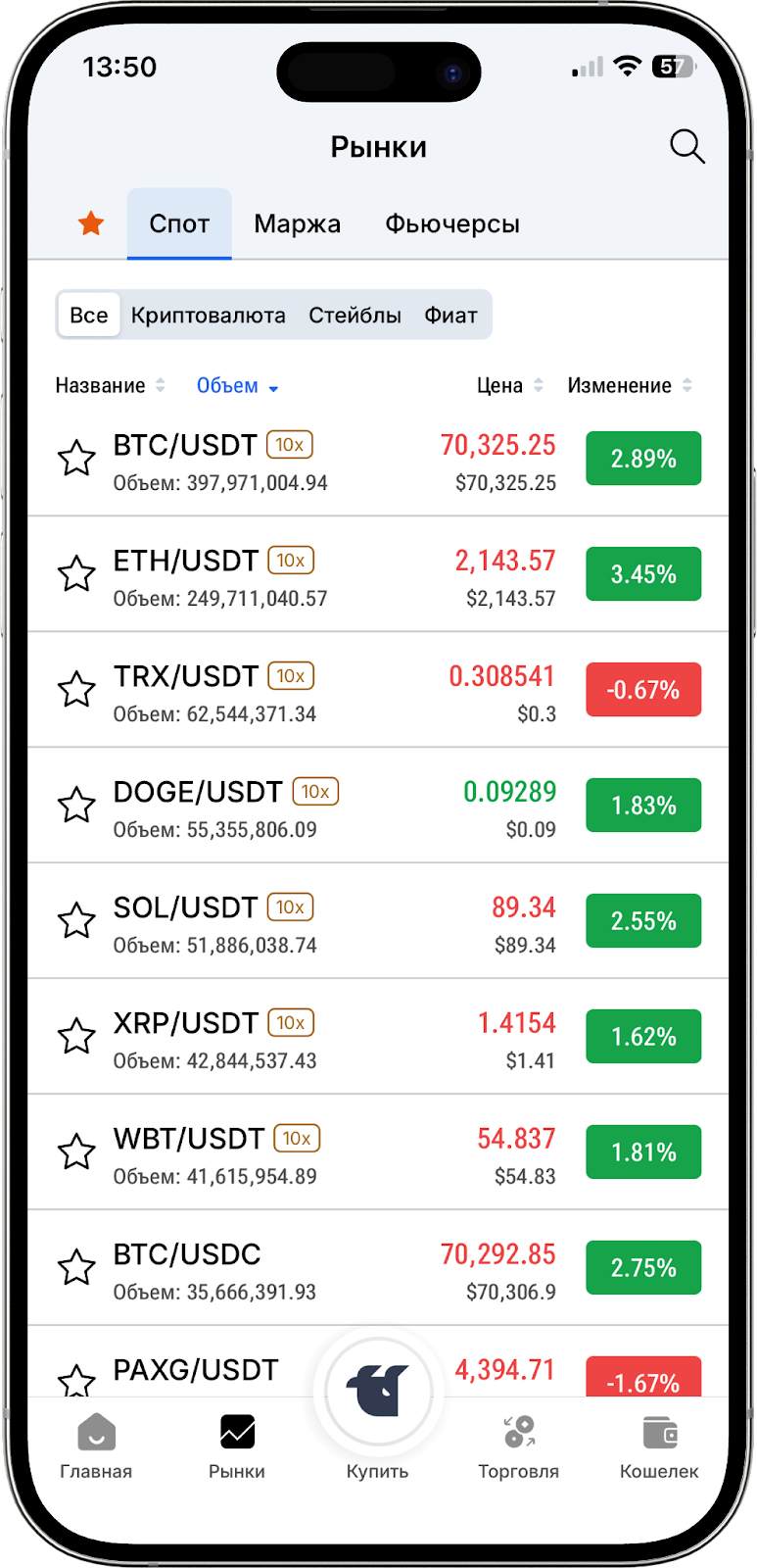 В верхней части торгового терминала можно выбрать нужную торговую пару. В соответствующем поле вы можете ввести тикер или отфильтровать список, например, по спотовым или фьючерсным парам. Рядом с выбранной парой отображается краткая статистика, включая объем торгов и изменение курса за 24 часа.