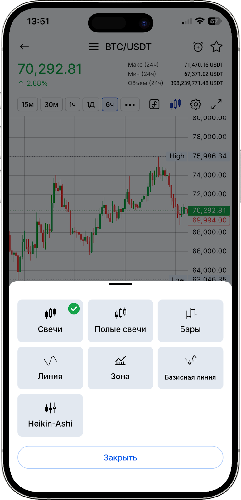 В этой же секции можно выбрать временной интервал свечей, настроить быстрый доступ к избранным инструментам, изменить тип отображения графика (например, японские свечи или бары), а также отредактировать режим отображения.
