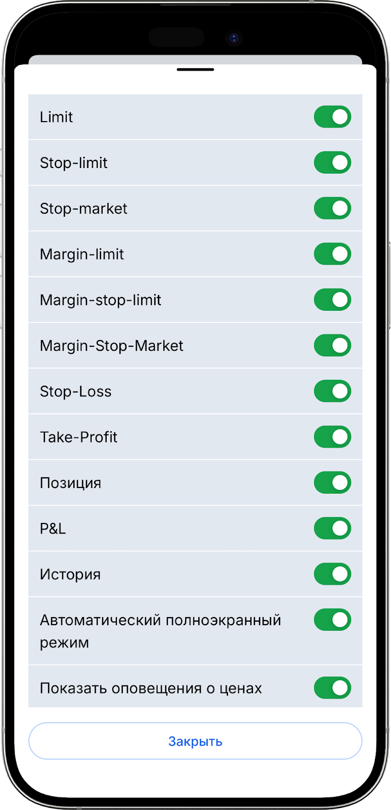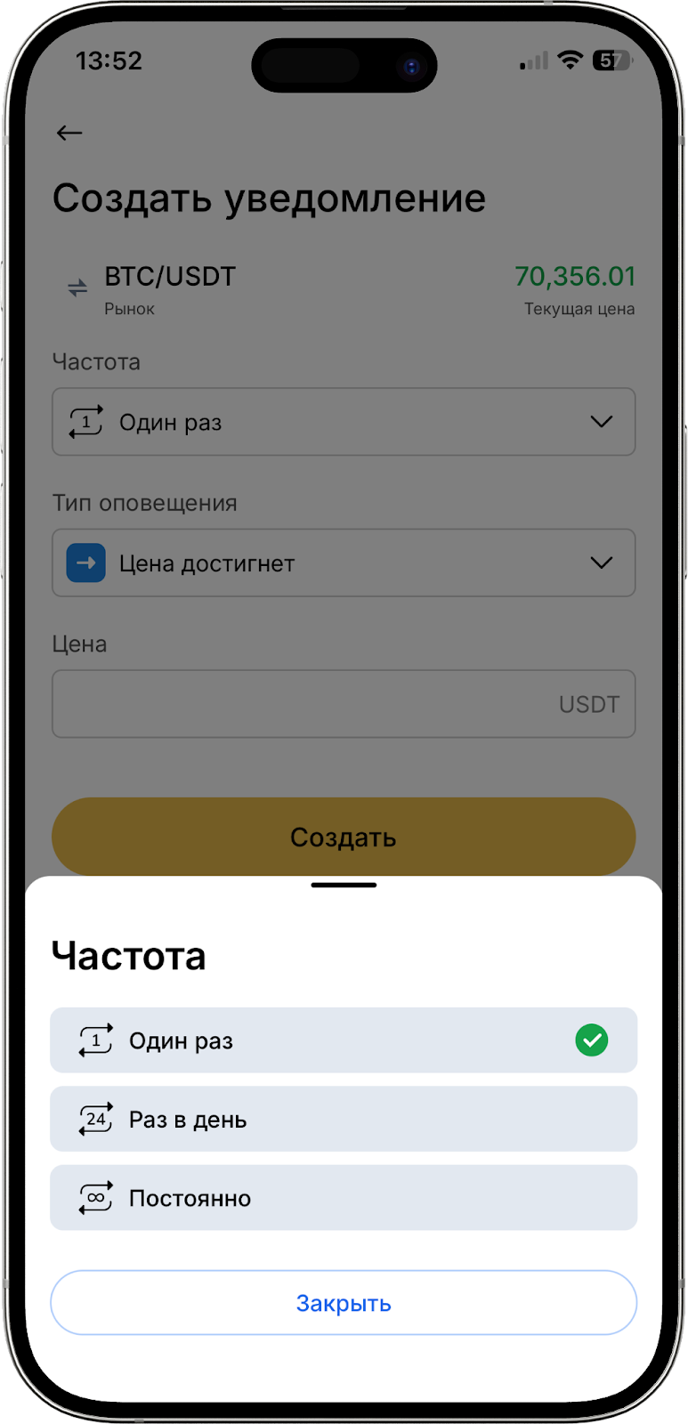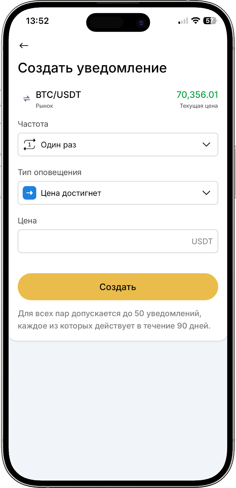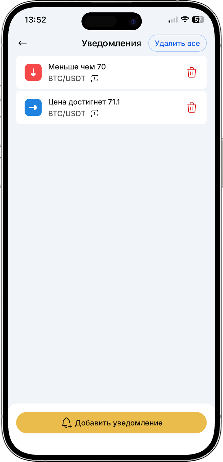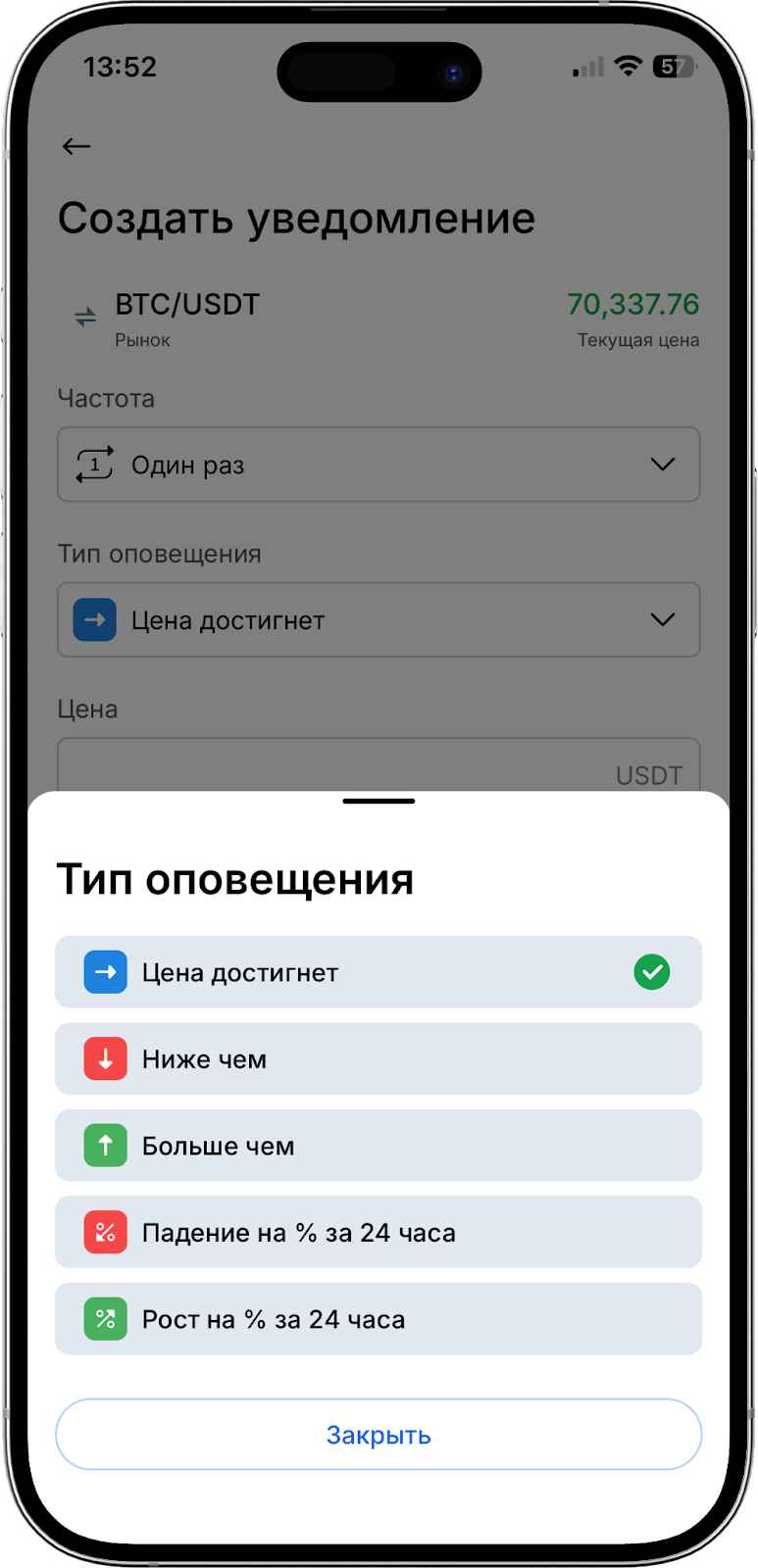 Кроме того, вы можете развернуть график на полный экран для более удобного анализа, или настроить уведомления по конкретной цене или процентному изменению актива, выбрав значок будильника.