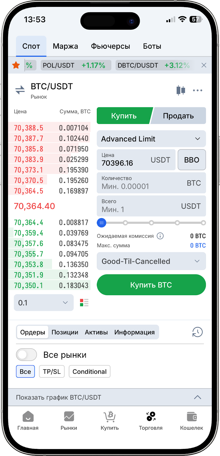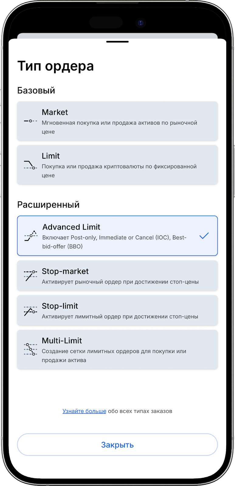 - Advanced Limit – лимитный ордер с дополнительными условиями исполнения: Post-only, BBO или IOC.