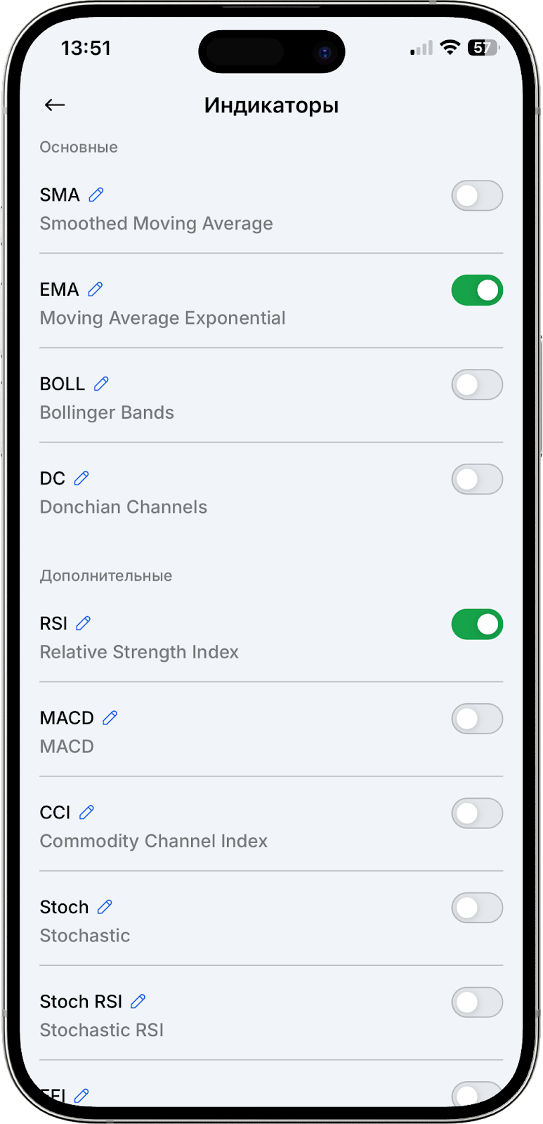 Отдельно стоит отметить выбор индикаторов и инструментов для анализа рыночных движений и трендов на графике. Здесь можно добавить к графику различные индикаторы, такие как EMA (экспоненциальное скользящее среднее) для выявления трендов или Volume (объем торгов) для анализа активности на рынке. Кроме того, доступны дополнительные инструменты, позволяющие детализировать технический анализ, например RSI, MACD или Bollinger Bands.