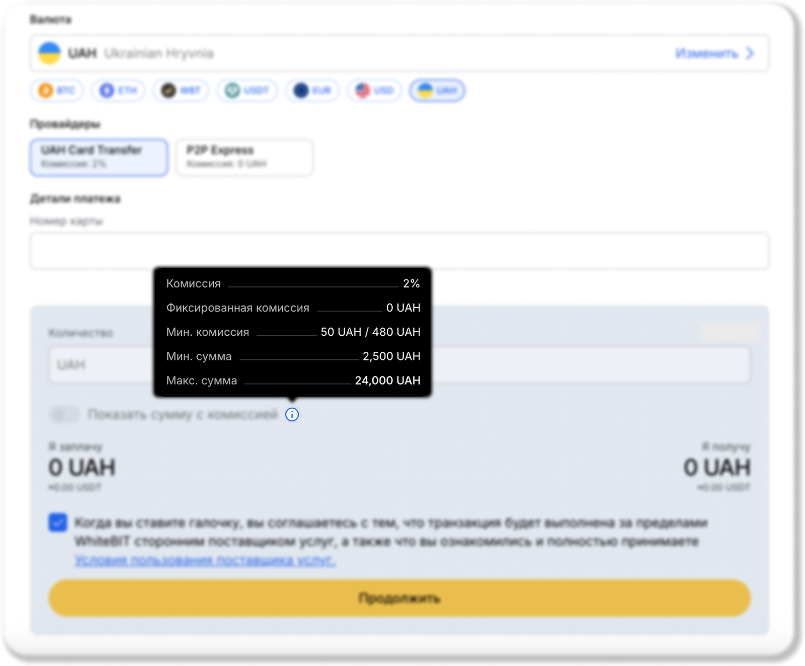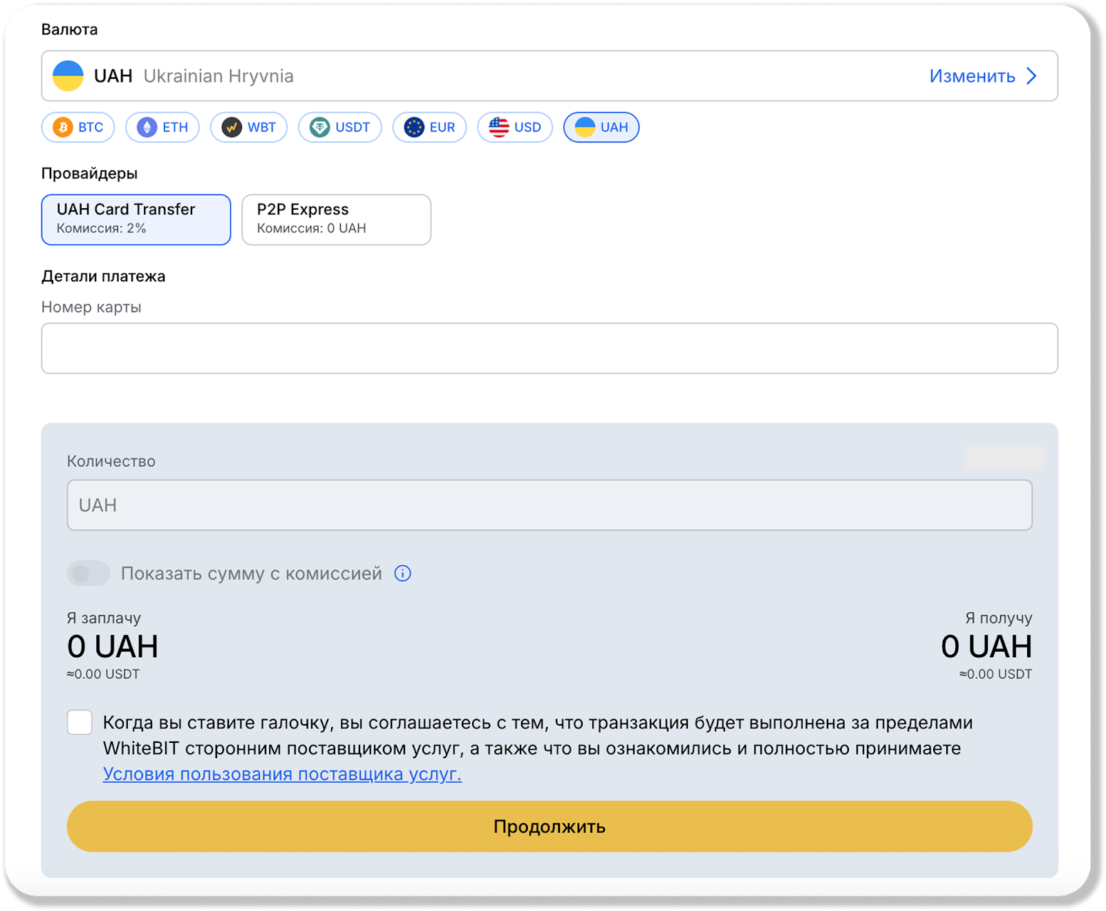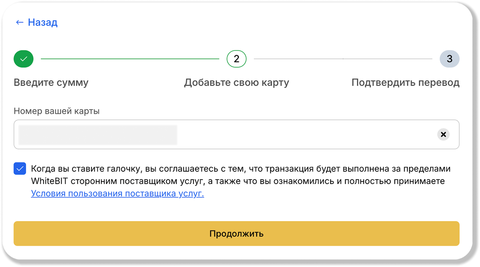 - Необходимо ознакомиться с условиями пользования поставщика услуг и поставить галочку, что вы согласны с тем, что транзакция будет выполнена вне биржи WhiteBIT сторонним поставщиком услуг, а также подтвердить, что вы ознакомились и полностью принимаете Условия пользования поставщика услуг.