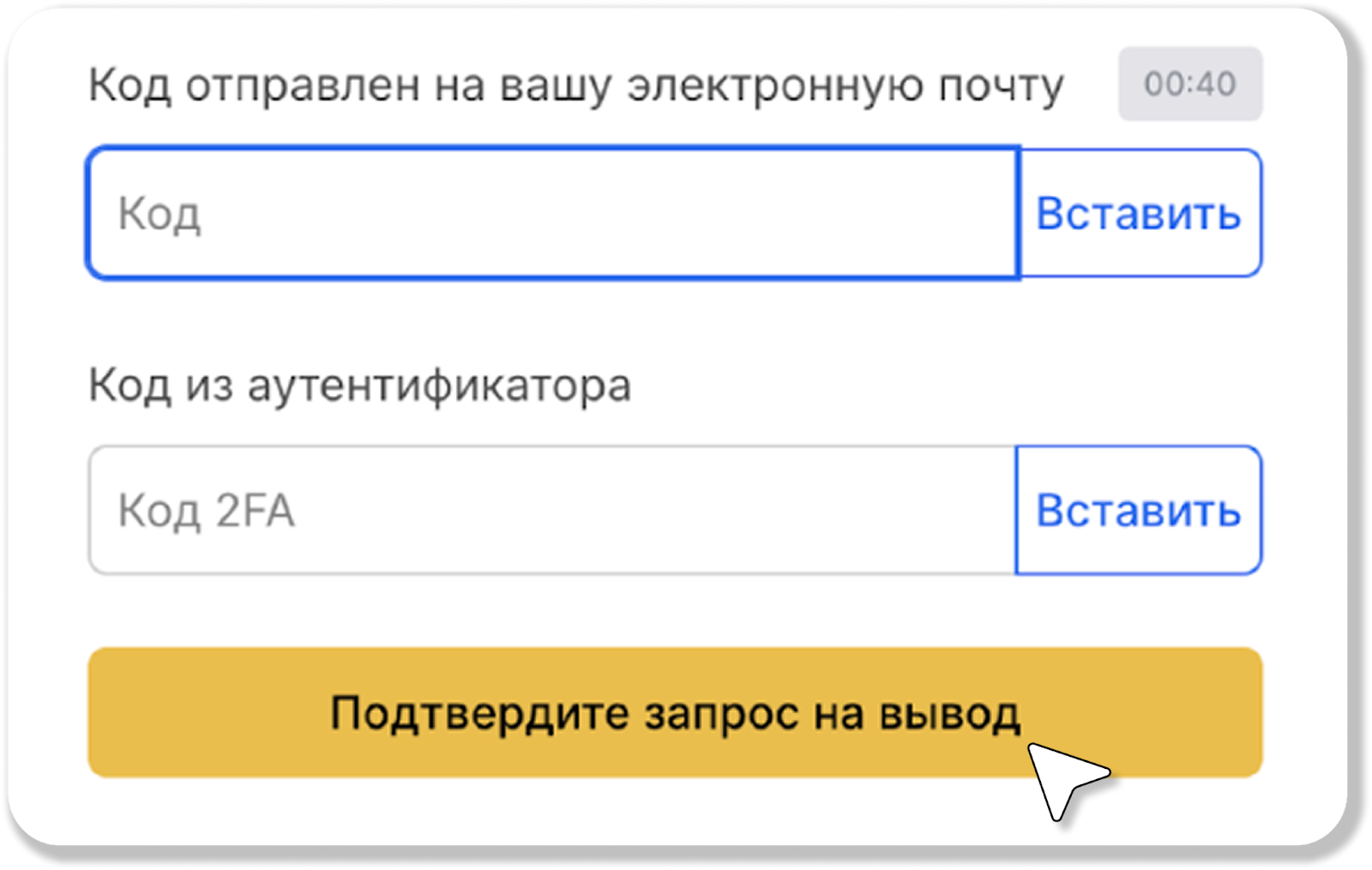 - После этого подтвердите операцию указав код, который был отправлен на вашу почту, и нажмите кнопку "Продолжить". Если у вас включена двухфакторная аутентификация (2FA) — дополнительно введите код из программы-аутентификатора (например, из Google Authenticator).