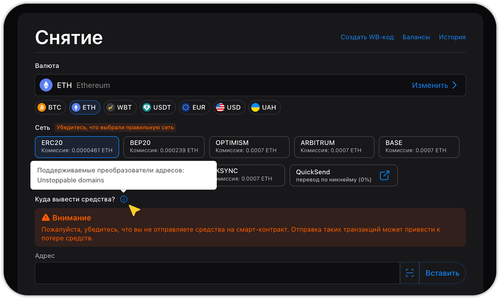 На WhiteBIT преобразователи адресов Ethereum Name Service (ENS) и Unstoppable Domains поддерживаются для вывода в следующих сетях: