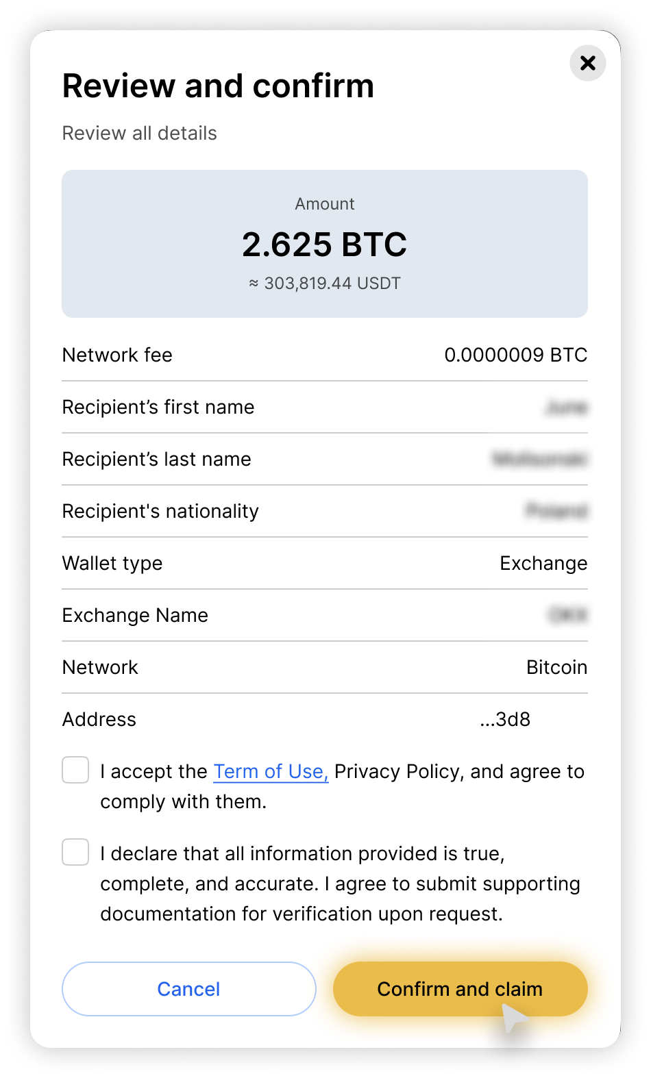 Подробности можно посмотреть в Explorer, окно отображается в течение 24 часов, после чего WB Check помечается как недействительный, а действие ссылки истекает. - Claim request cancelled - попытка подачи заявки на получение была отменена. Вы можете повторить попытку снова, но сначала рекомендуется проверить предоставленные данные и/или выбрать новый адрес для получения средств.