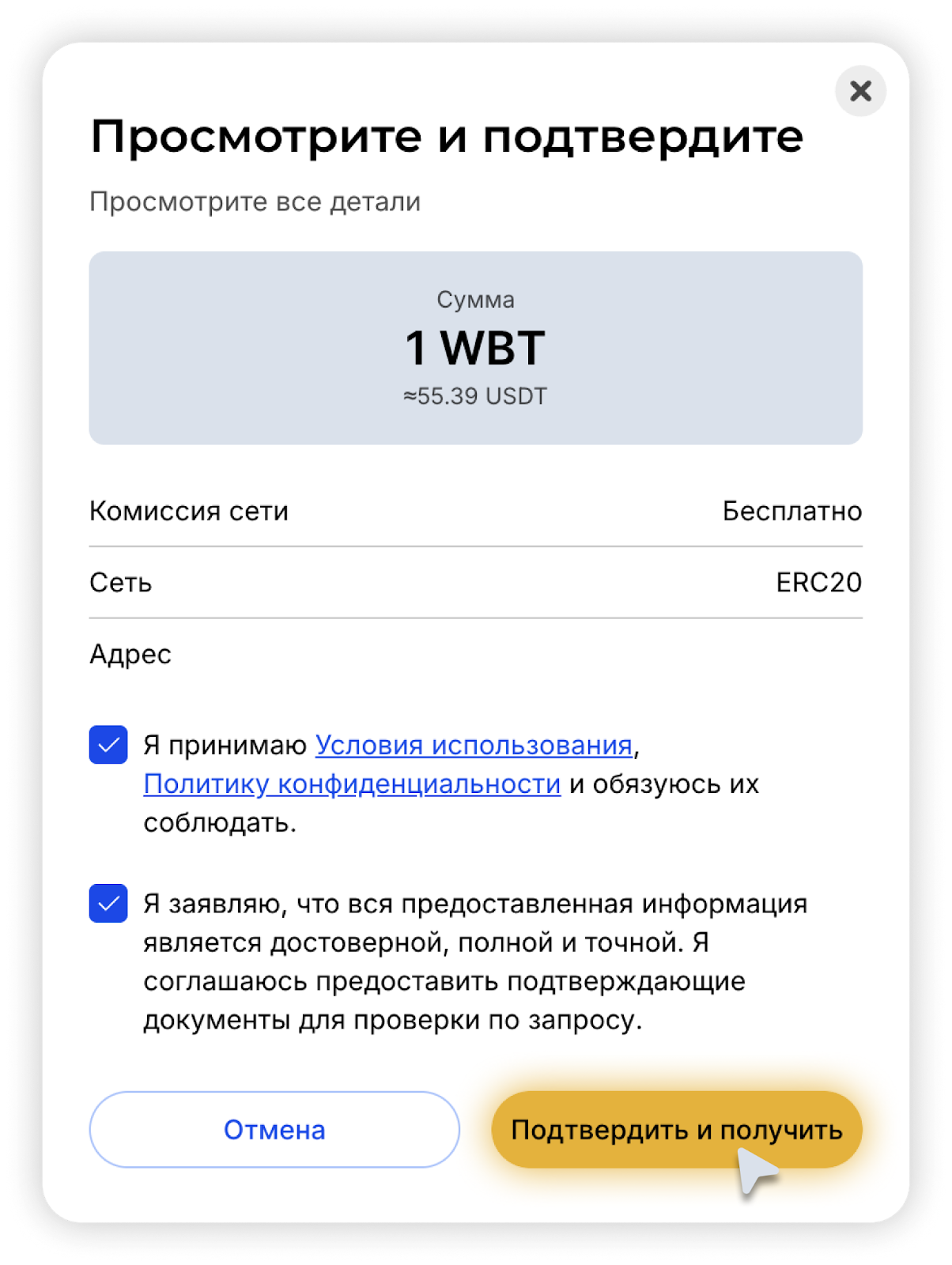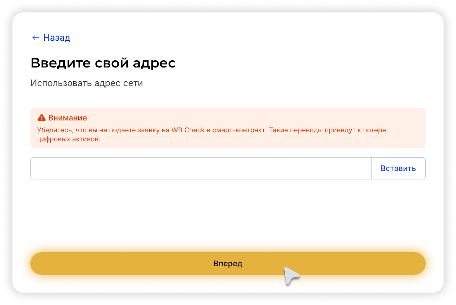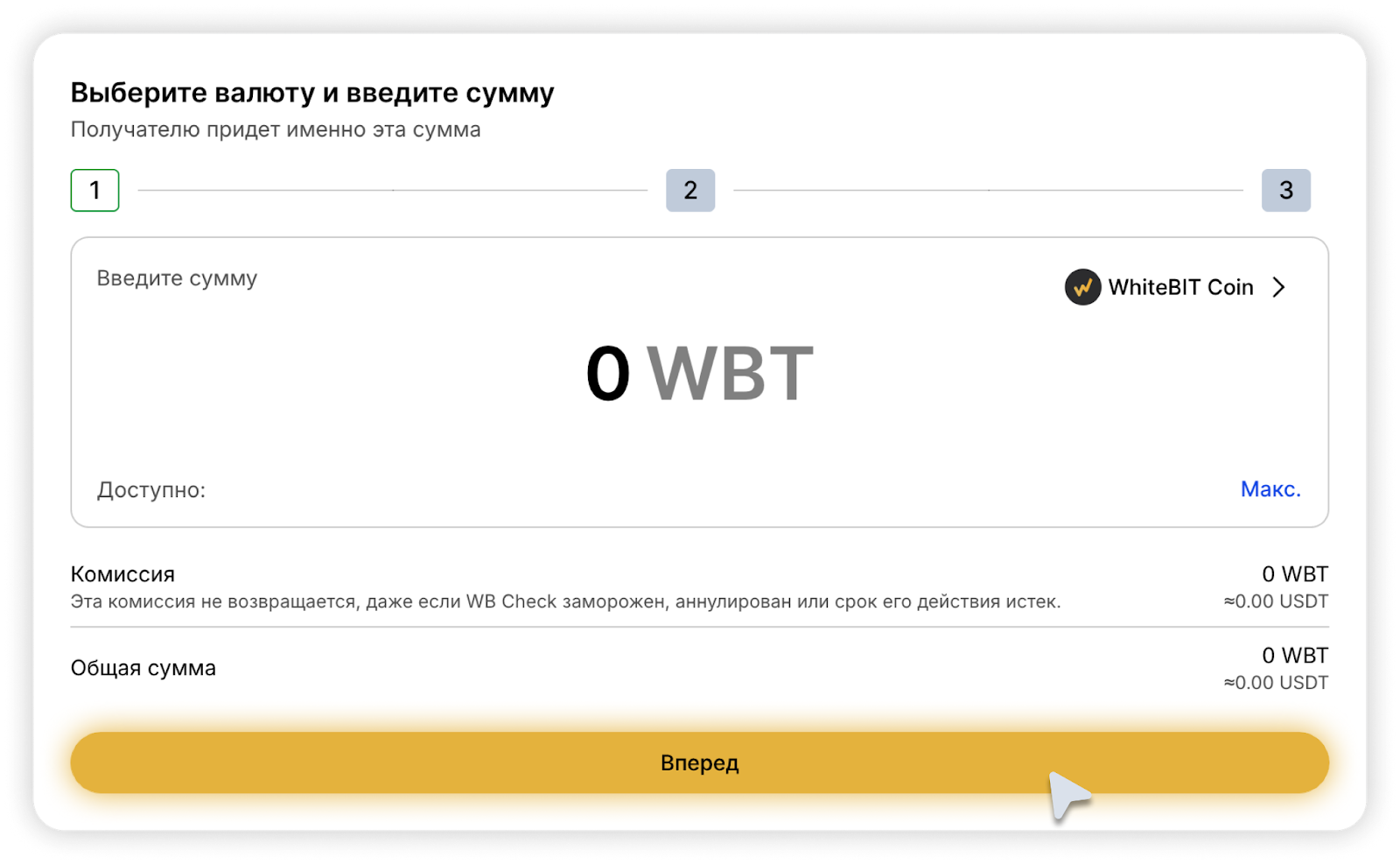 Обратите внимание: вы можете получить лишь ту же самую криптовалюту, что была отправлена в WB Check, комиссия сети будет взиматься с общей суммы чека.